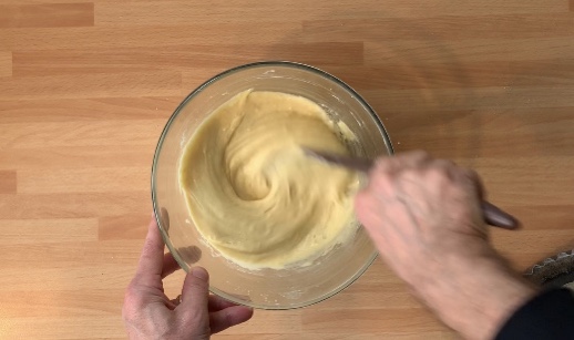 In un’altra ciotola versate lo zucchero e la crema di uova mescolando bene con la frusta, unire le polveri amalgamando bene il composto