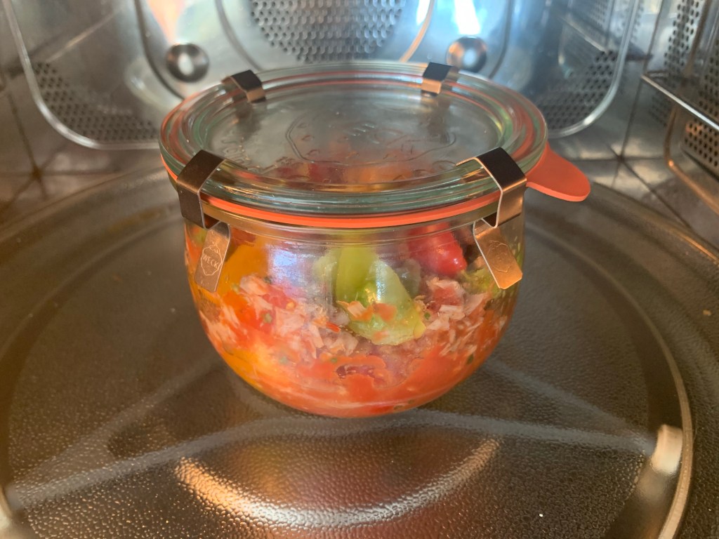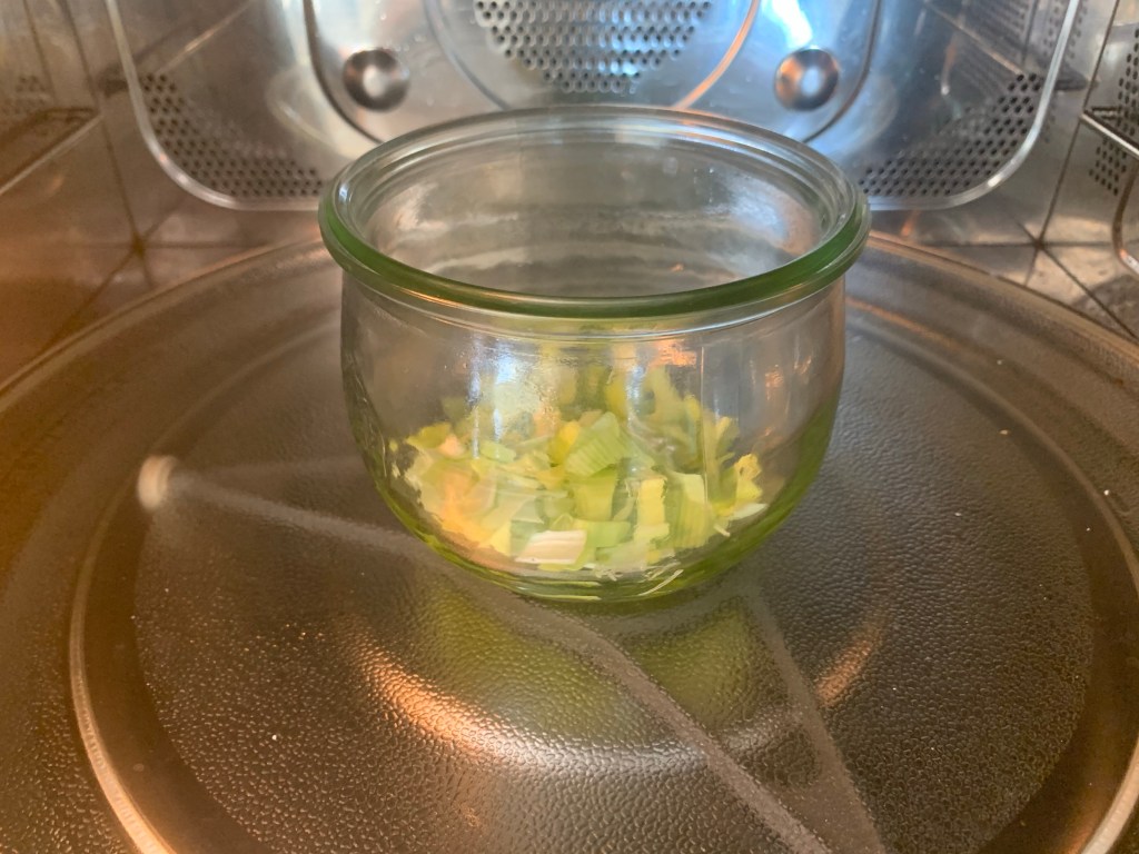 In un vasetto Weck da 500 ml bersare l’olio e il cipollotto e farlo soffriggere al Microonde senza tappo per 90 secondi a 750 watt
