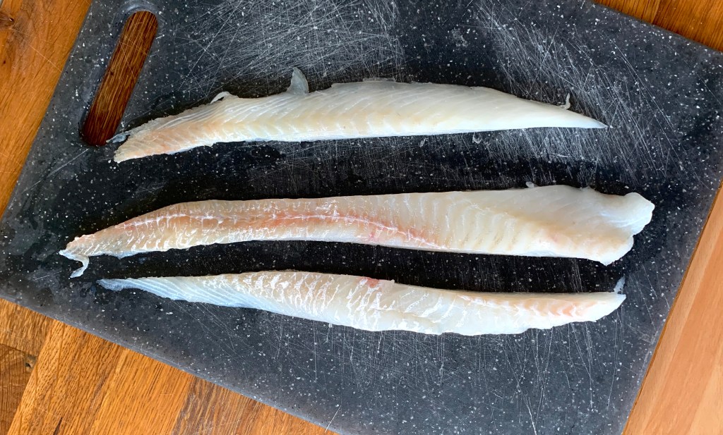 Lavare ed asciugare il filetto di merluzzo poi tagliarlo in 3 pezzi in verticale