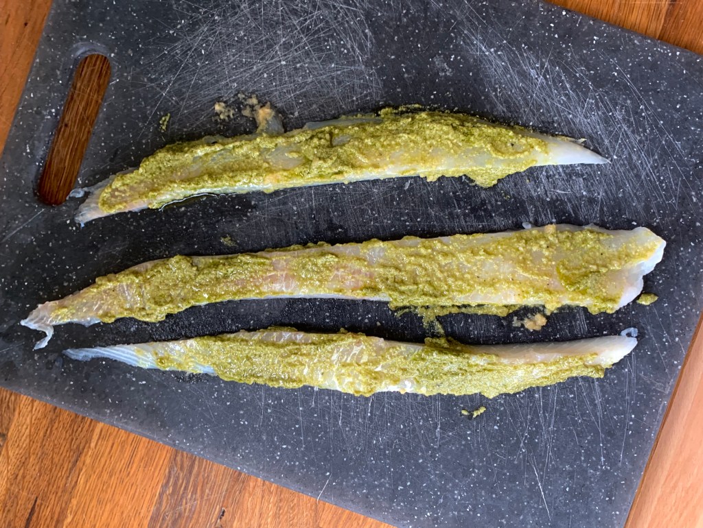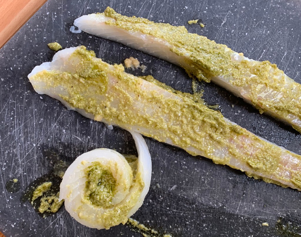 Spennellare i tre filetti con il pesto, un pizzico di sale su ognuno e poi arrotolarli uno sull’altro a creare una spirale