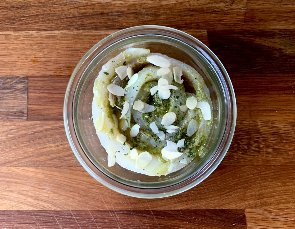 Adagiare il pesce nel vasetto Weck da 500 ml e versare sopra un cucciaio d’olio e le mandorle, chiudere il vasetto con la guarnizione il tappo e 4 gancetti