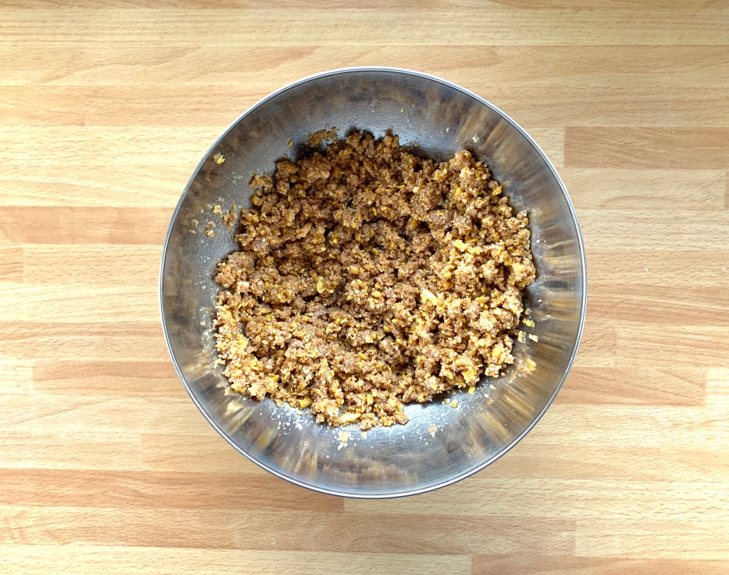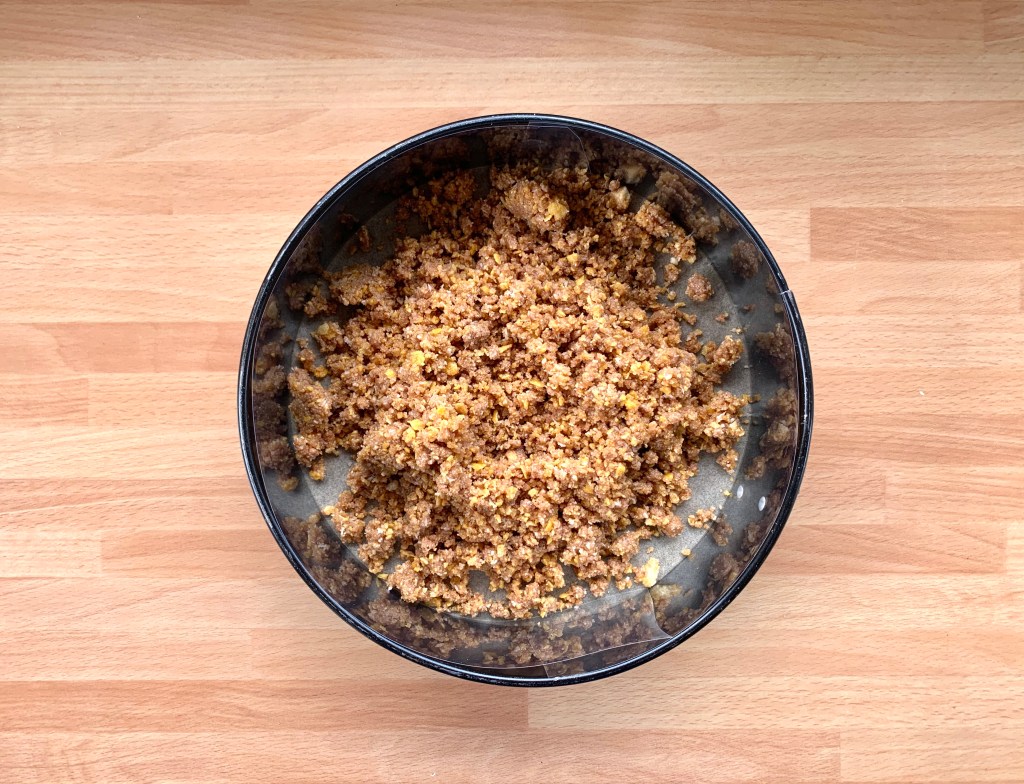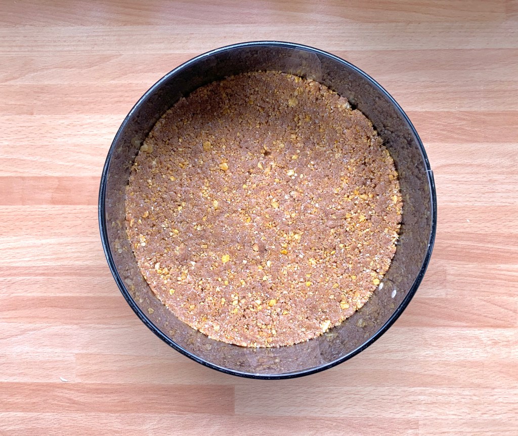 Per la base ho unito in un mixer, nel mio caso il Bimby, tutti gli ingredienti e li ho frullati fino a formare un impasto umido e sabbioso, con il quale ho coperto la base di una tortiera con anello rimovibile da 23 cm foderato con carta forno, poi l’ho messo nel congelatore per 20 minuti