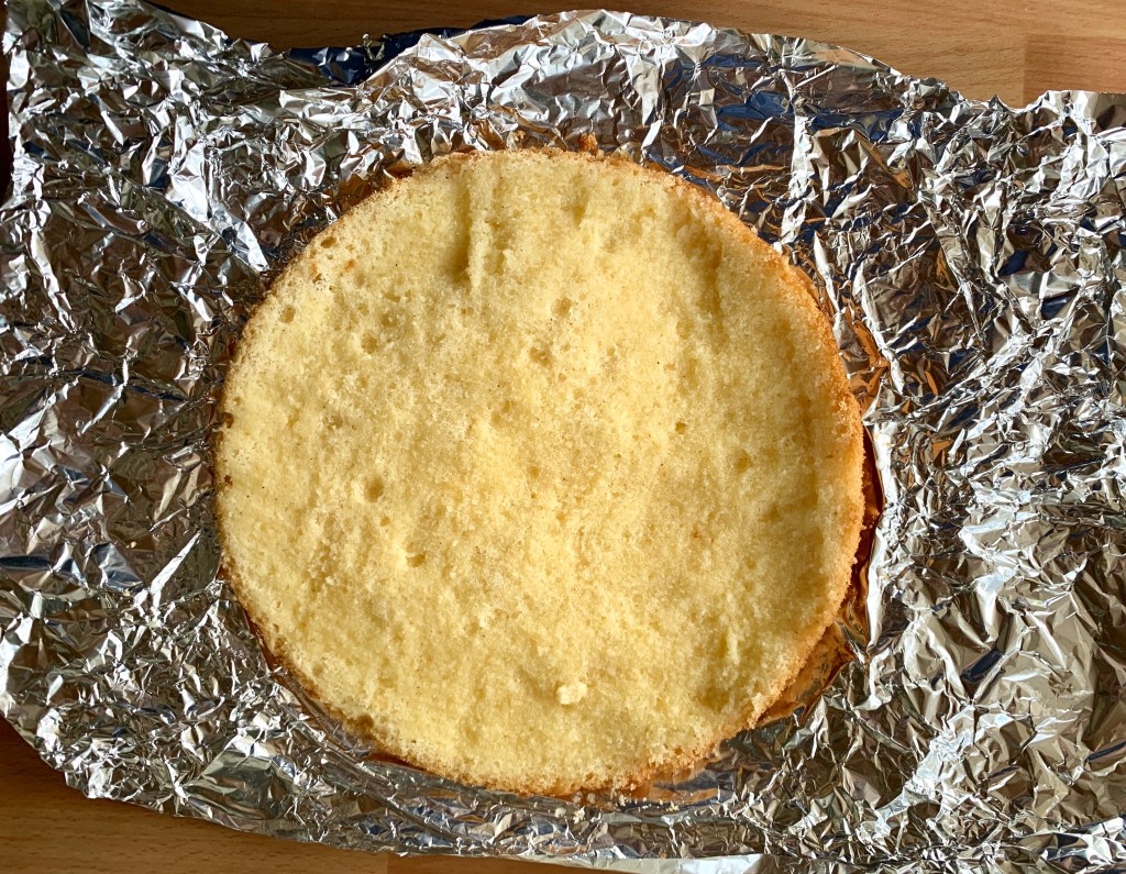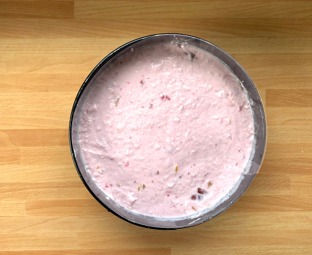Ho versato metà del composto sulla base di biscotti, adagiato il disco di pan di spagna che ho inzuppato con uno sciroppo fatto con 50% di limoncello e 50% d’acqua, ho versato il resto del composto allo yogurt e messo in congelatore per 2 ore