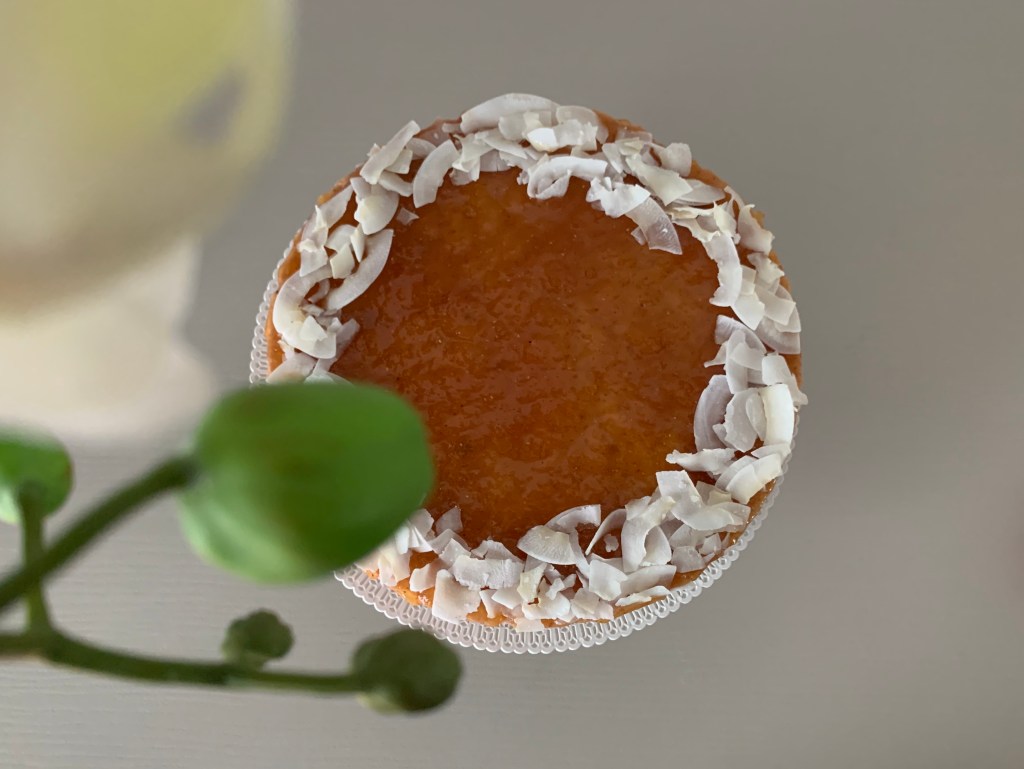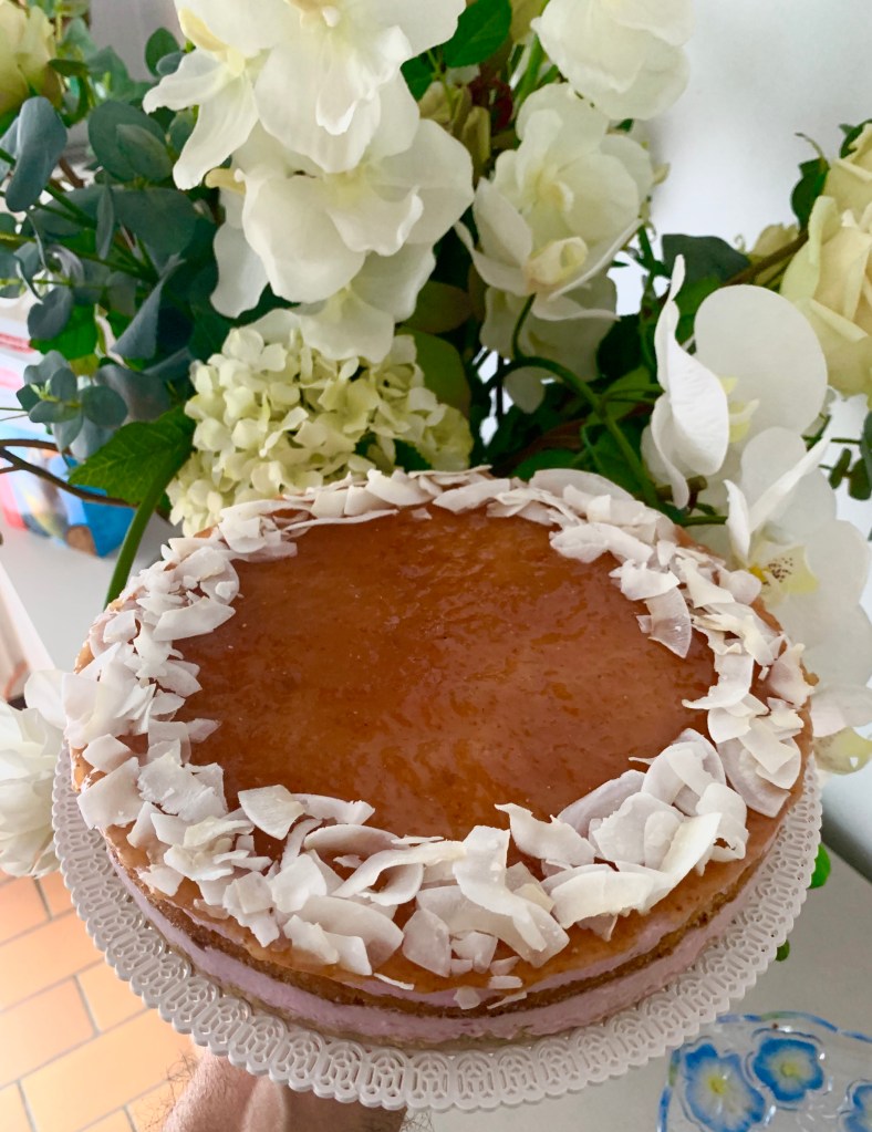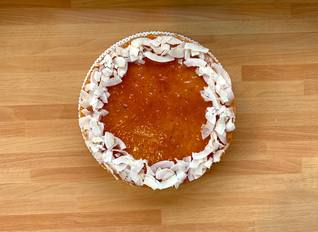 Prima di servirlo ho coperto la superficie con la confettura di fichi e tutto intorno alla circonferenza con fiocchi di cocco essiccato