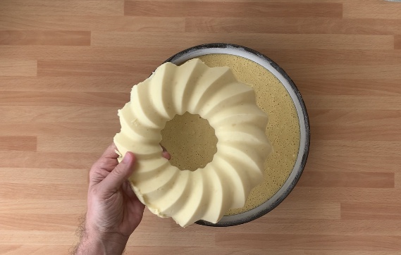 Il giorno prima ho preparato la crema pasticciera, se volete la ricetta vi metto qui il link, l’ho fatta raffreddare e poi gli ho aggiunto la panna montata senza zucchero, ho riempito una forma ad anello in silicone e fatto congelare un giorno per l’altro