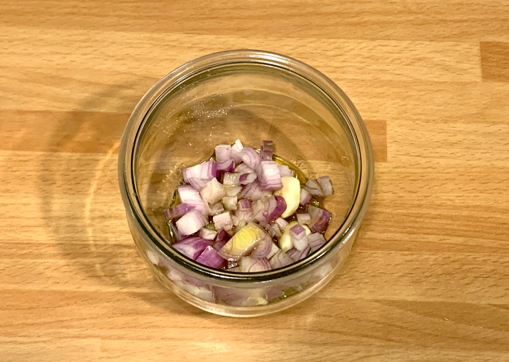 Versare in un vasetto da 500 ml lo scalogno a cubettini, l’aglio e l’olio evo, mettere il vasetto al microonde senza tappo per 2 minuti a 750 watt