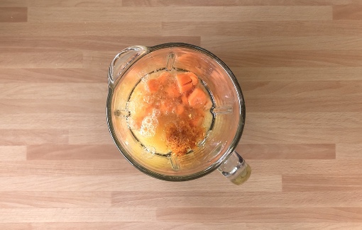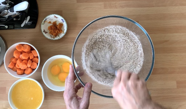 In un frullatore unire le uova, l’olio, lo zucchero, il succo di arance, il sale, le zest di arance, le carote a rondelle e frullare per 3 minuti