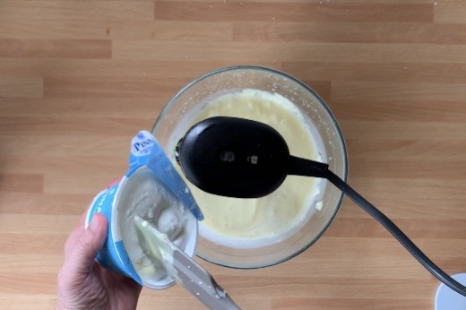 Versare il composto liquido nelle farine ed amalgamare bene fino ad integrare gli ingredienti, poi aggiungere il lievito ed integrarlo al composto sempre con la frusta