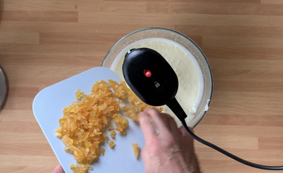 Aggiungere la ricotta di pecora, i cubettini di di arancia candita e la strega e frullare fino a rendere una crema omogenea