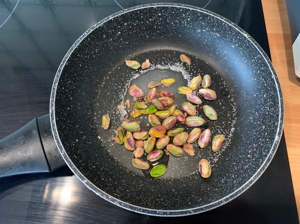 Per i pistacchi pralinati : versare in un pentolino tutti gli ingredienti e portare a 100 gradi fino a caramellare tutt’intorno alla frutta secca, stenderle su una placca con carta forno per farle raffreddare