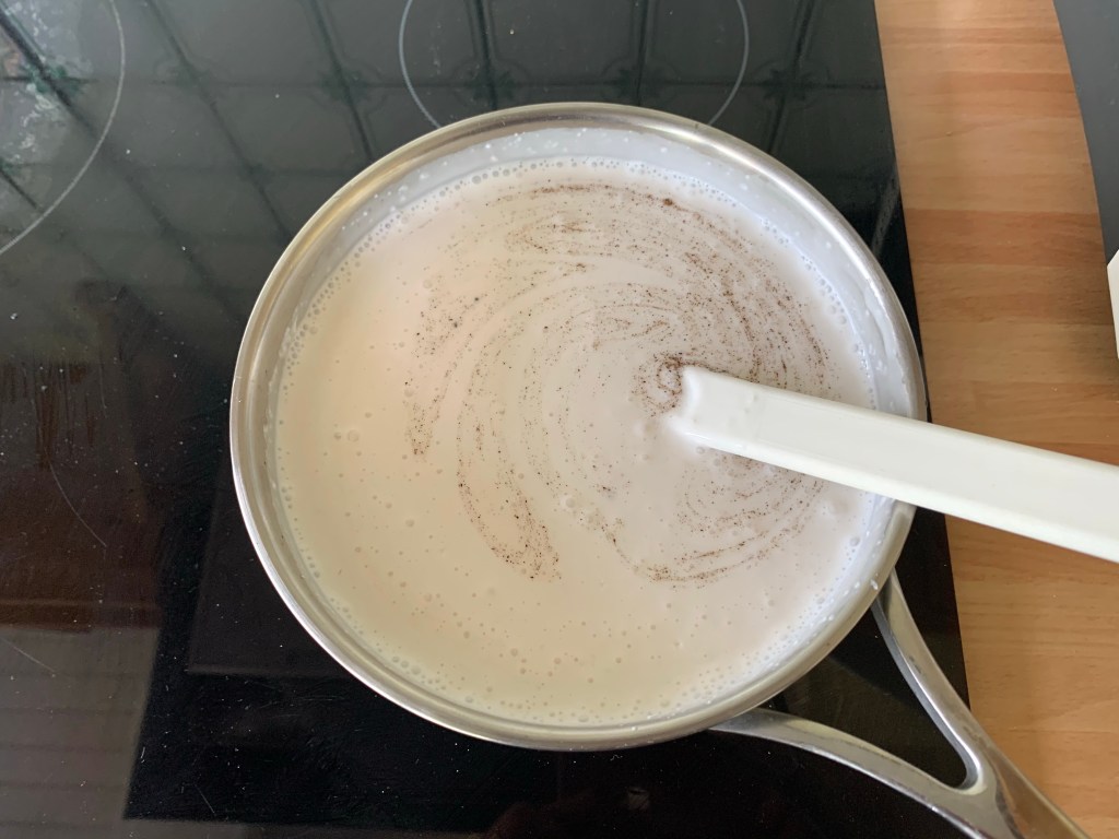Unire in un pentolino il latte, lo zucchero e la farina di cocco, mescolare e portare a primo bollore e spegnere il fuoco