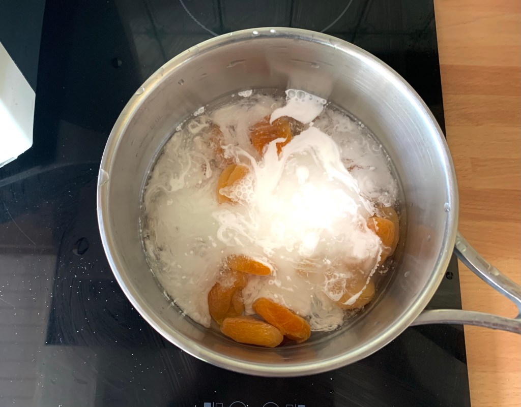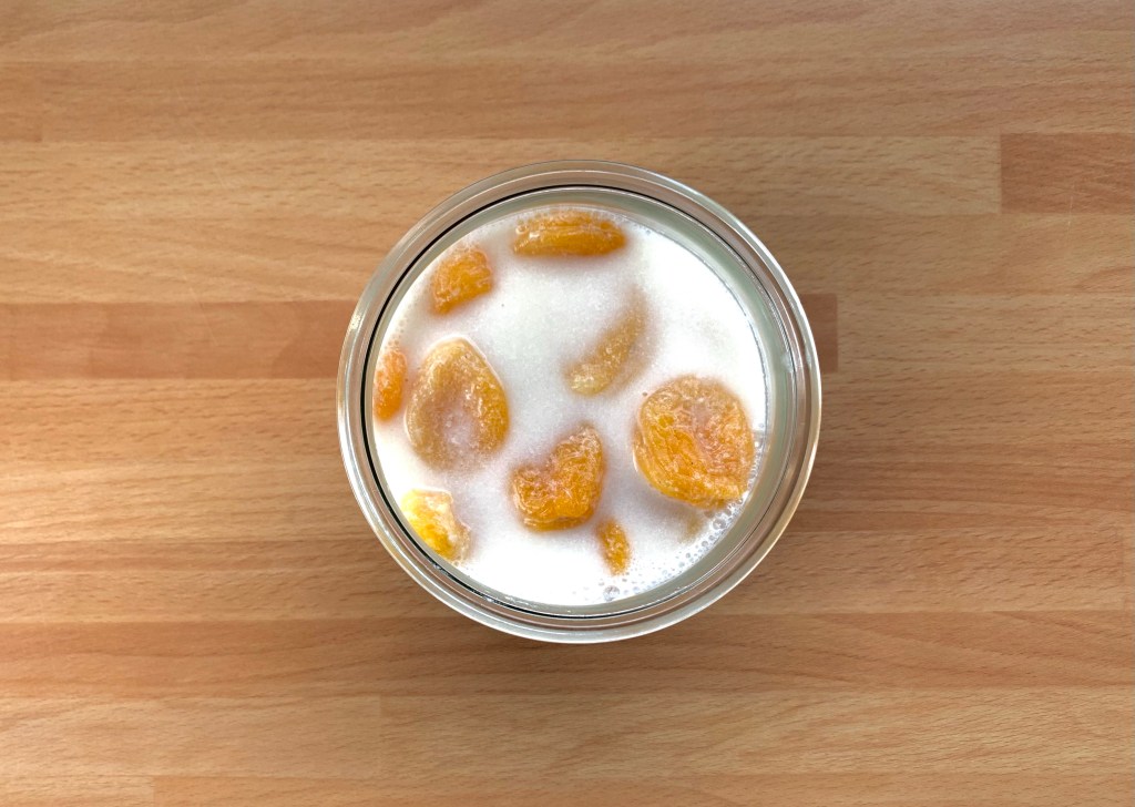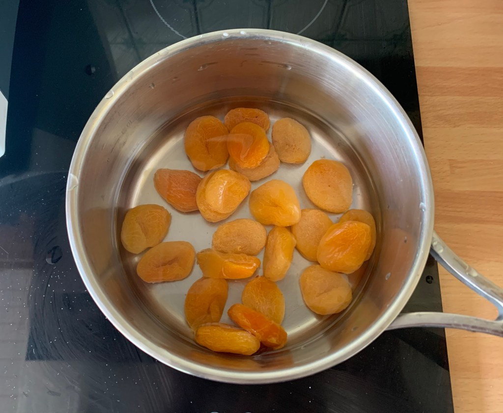 Nel frattempo unire in un pentolino le albicocche, l’acqua, il latte di cocco, il miele, la vaniglia e far bollire per 5 minuti poi versare le albicocche con il suo liquido in un vasetto, lasciar raffreddare a temperatura ambiente e poi porre in frigo fino all’uso.