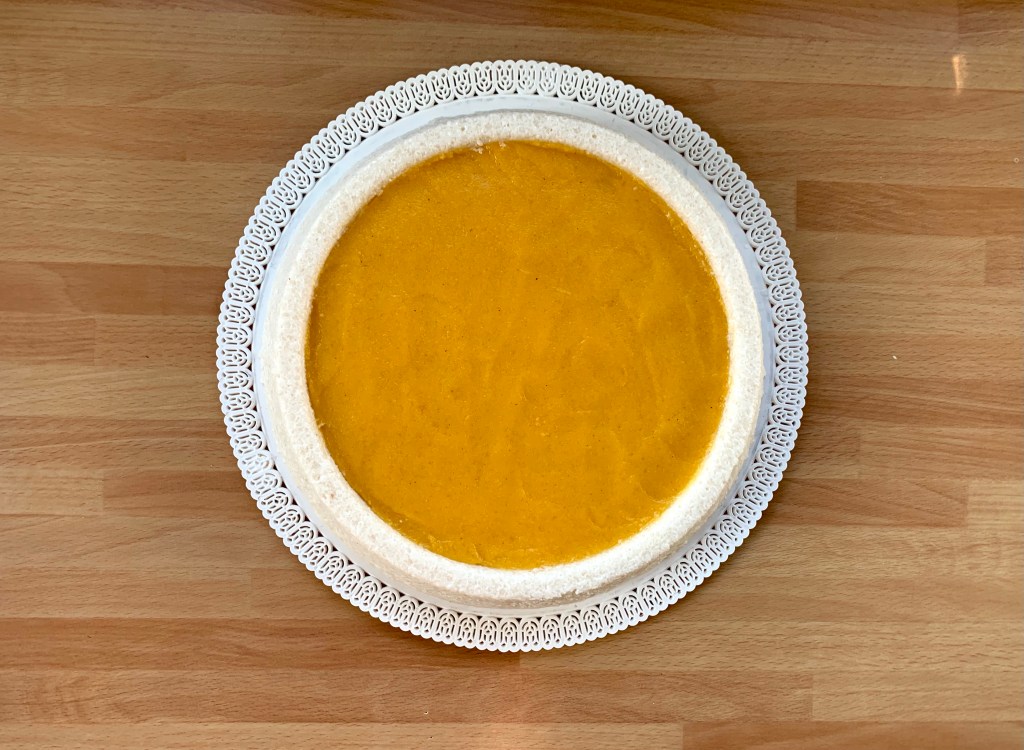 Versare il composto in una forma furba da 24 cm di diametro con incavo oleata, sbattere 3/4 volte sul piano per far uscire le bolle d’aria e permettere al composto di assestarsi nella forma, coprire con pellicola e metterla in frigo per 4/5 ore