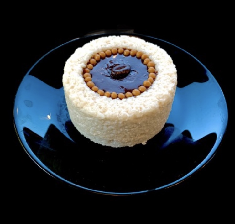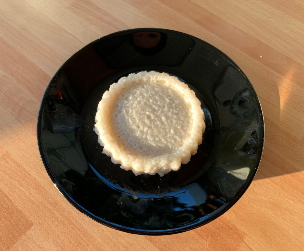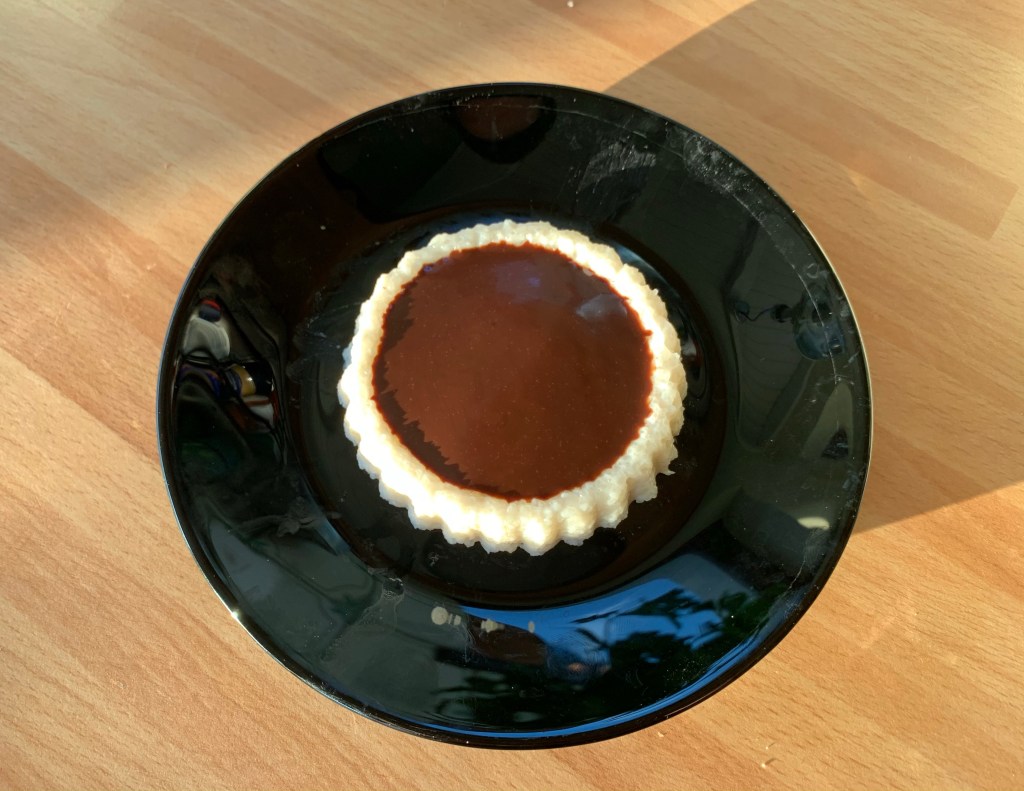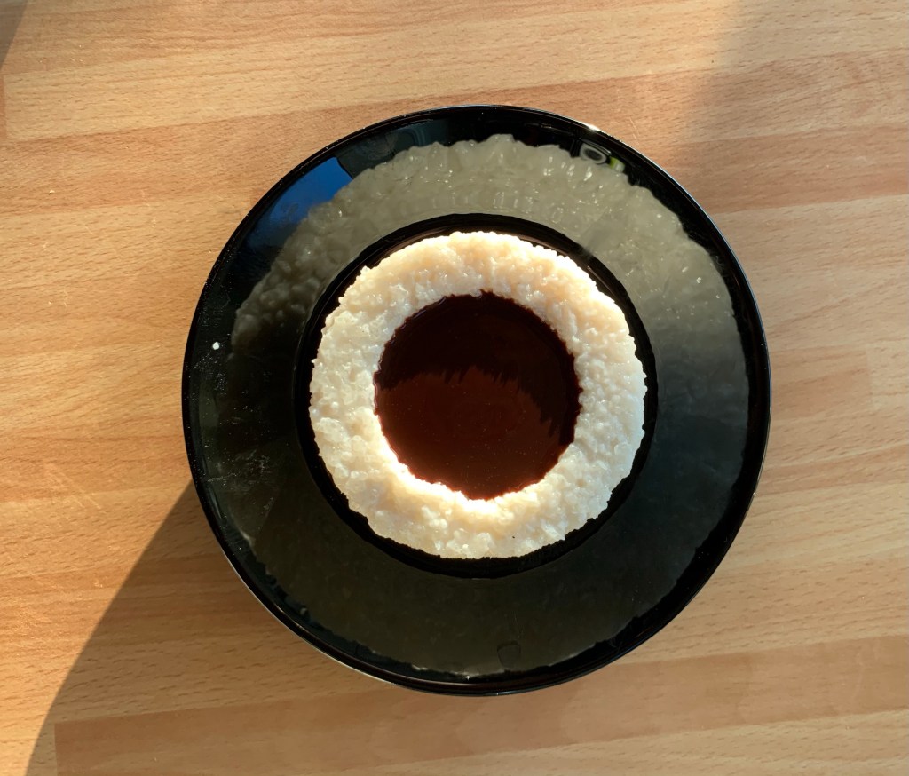 Delle perle di Tapioca imbevute di latte e farina di cocco che creano un gelatina naturale. Ho utilizzato una forma furba con incavo che ho poi farcito con delle albicocche secche reidratate frullate con un po’ di vaniglia.