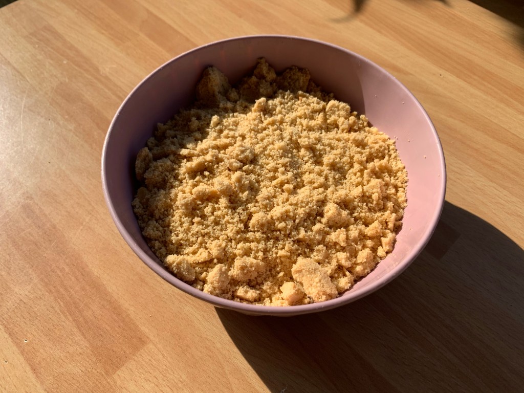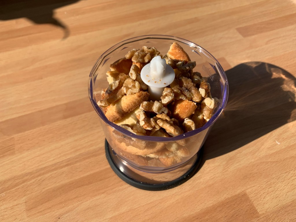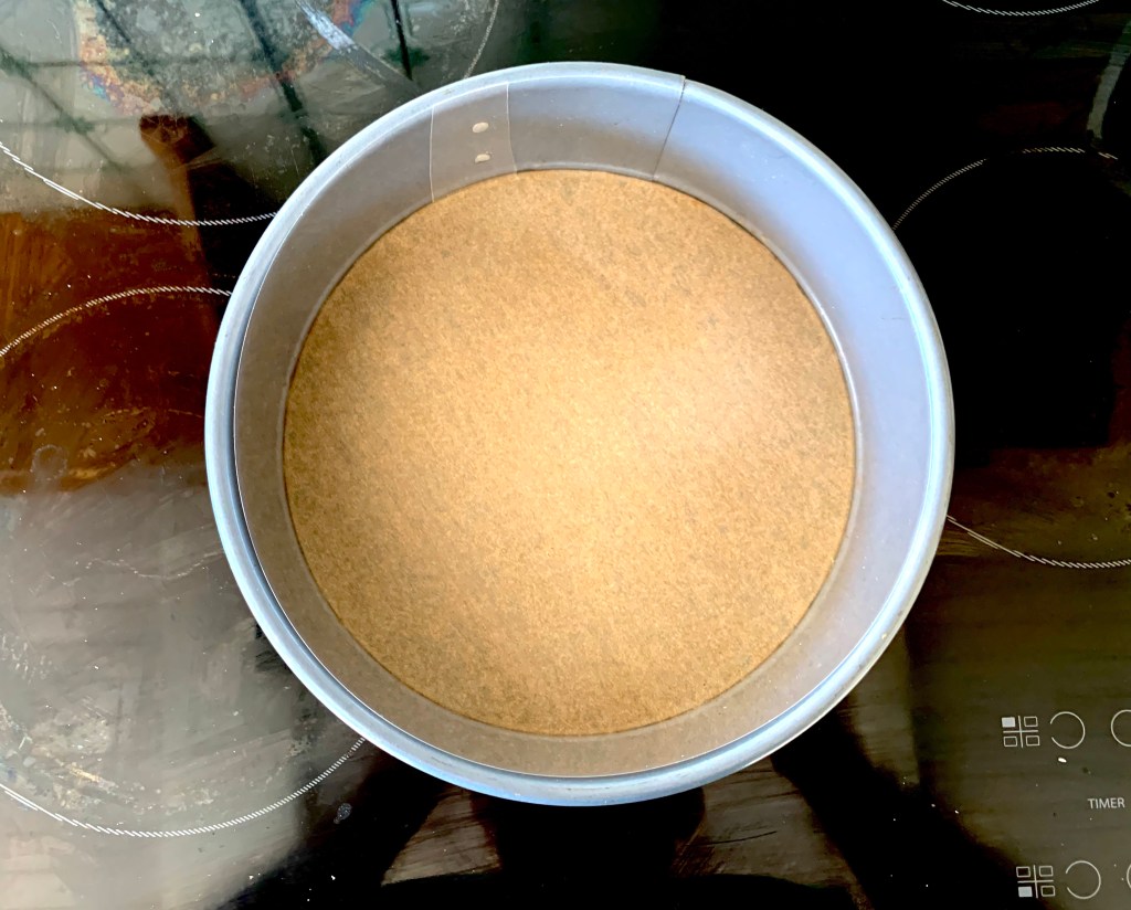 Per la base frullare i biscotti con la frutta secca e unire il burro sciolto, con il composto foderare il fondo di una tortiera da 18/20 cm coperta con carta forno e porre in frigo per 1 ora