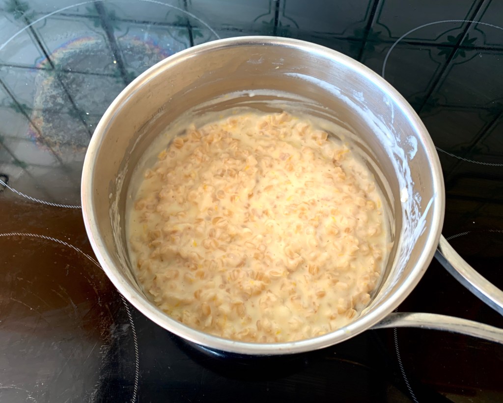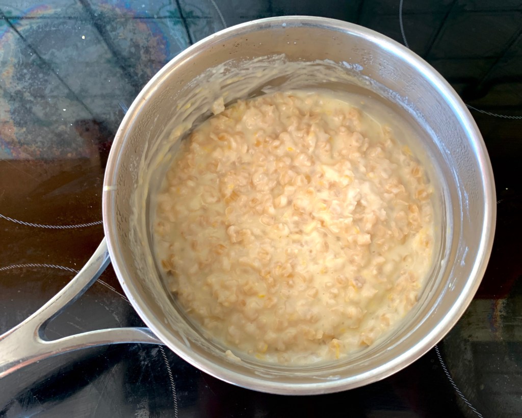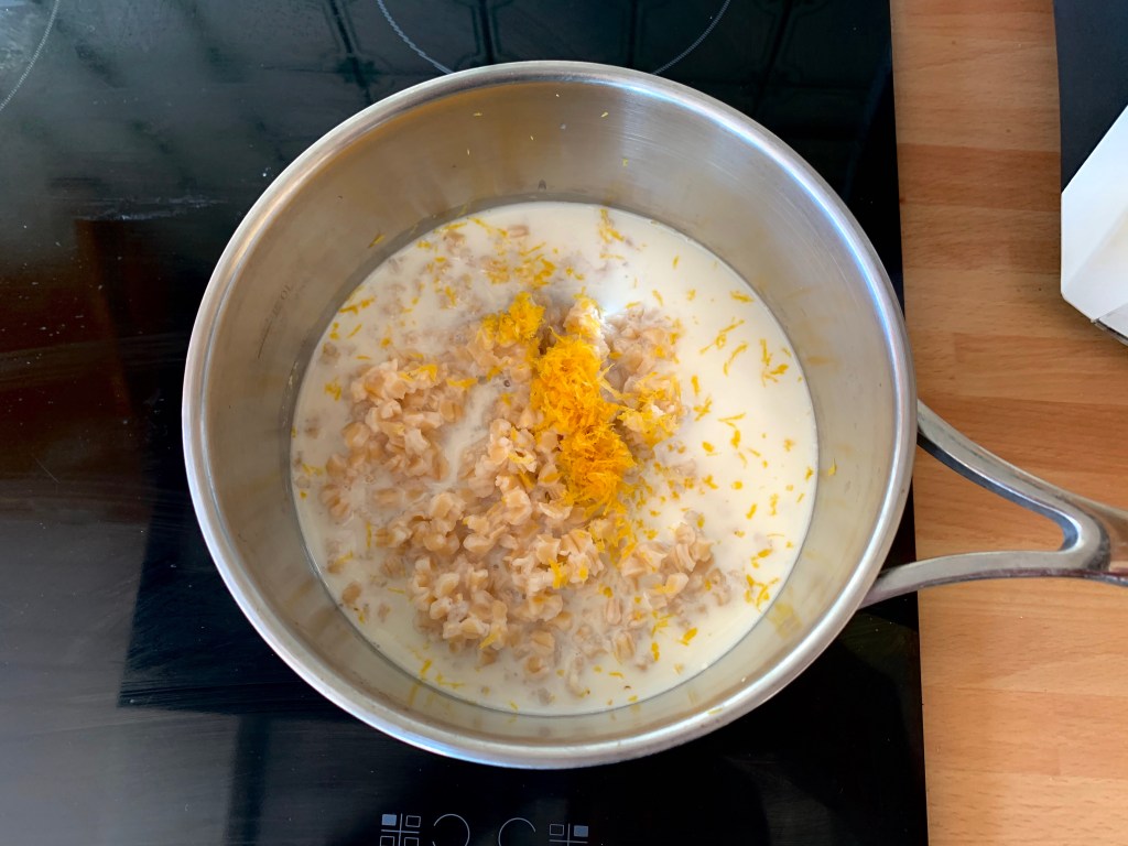 Nel frattempo preparare la Cheesecake : Mettere il grano cotto, il latte e le zest del limone in un pentolino e far cuocere fino all’assorbimento del latte. A fuoco spento aggiungere il burro e far raffreddare il composto.