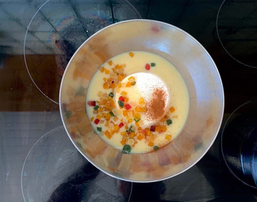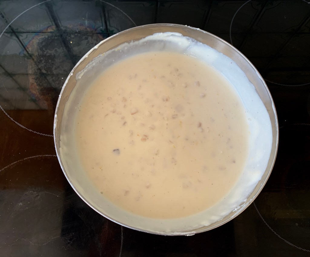 Infine aggiungere il grano cotto raffreddato e la colla di pesce pre ammollata in acqua fredda poi sciolta in un paio di cucchiai di panna e mescolare bene