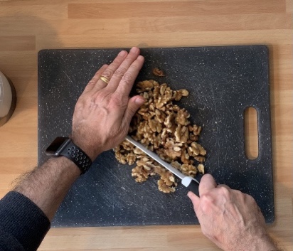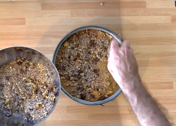 Per il Crumble di frutta secca: tritare grossolanamente con un coltello da cucina le noci e versarle in una ciotola, aggiungere lo zucchero, la cannella, il cocco, l’uva passa e mescolare gli ingredienti