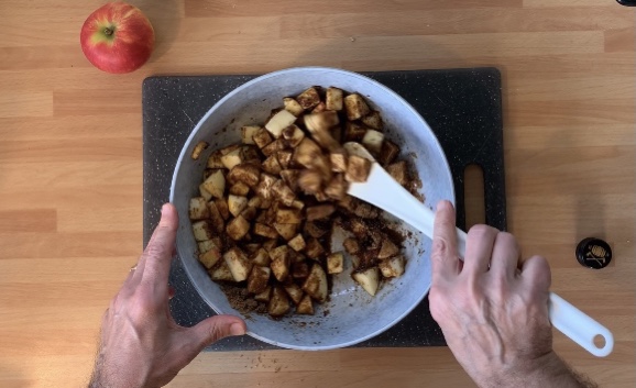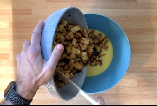 Aggiungere le mele con il suo liquido e le polveri un po’ alla volta mescolando con una spatola di gomma