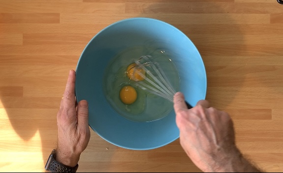 In una terza ciotola rompere le uova ed unire l’olio poi emulsionare con la frusta a mano