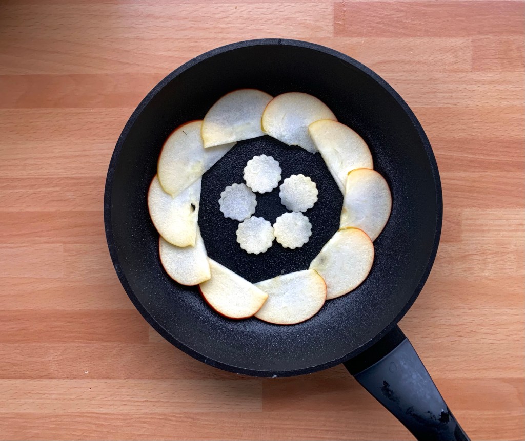 Ungere con olio vegetale un padellino da 20 cm e distribuire sul fondo delle fettine di mela