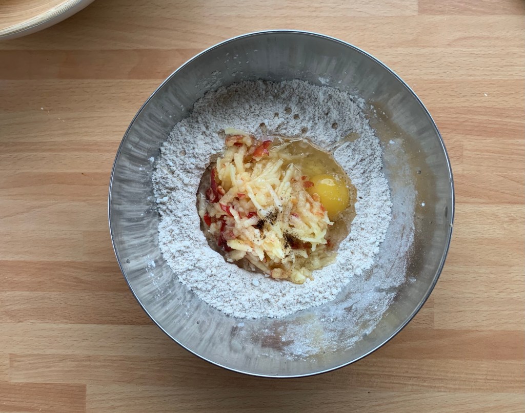 Creare nel centro delle polveri un incavo e aggiungere le uova, l’olio di cocco, la mela grattugiata e il succo di limone, mescolare gli ingredienti con un cucchiaio in legno