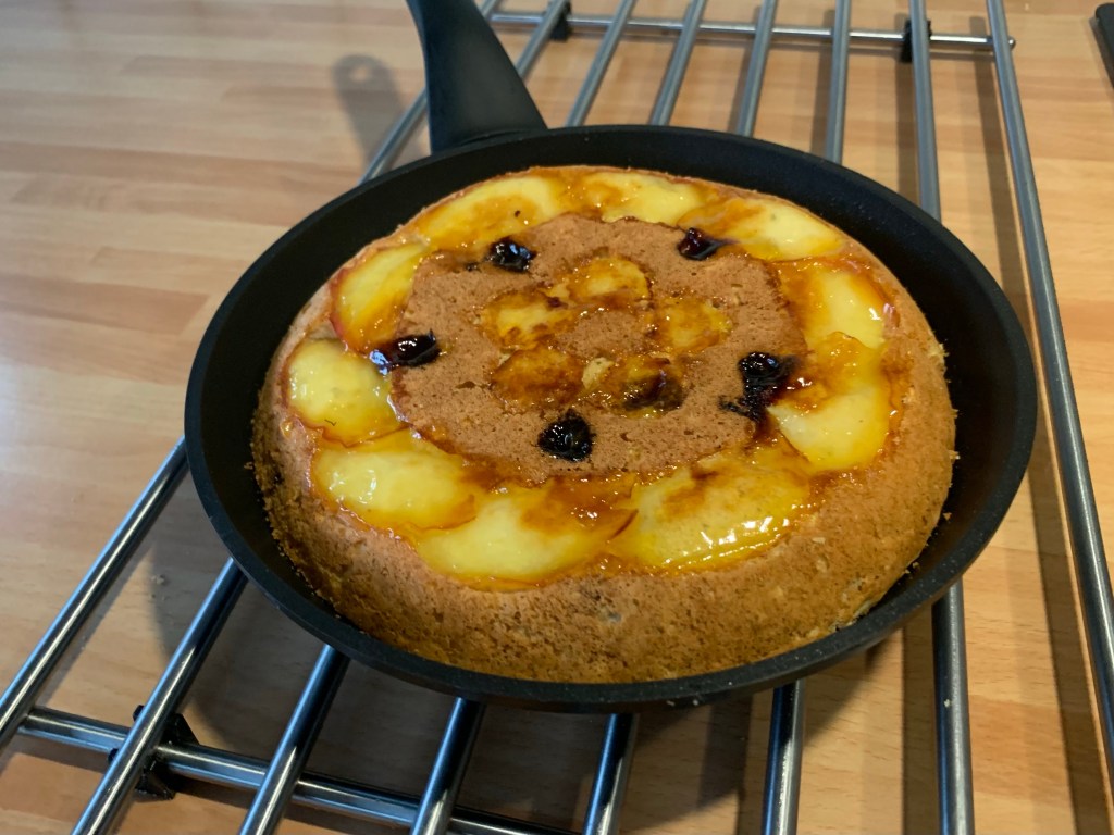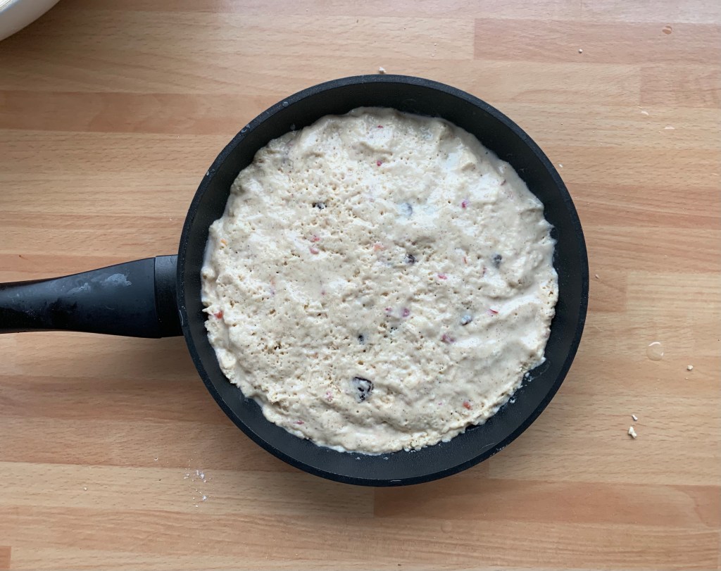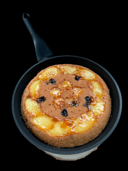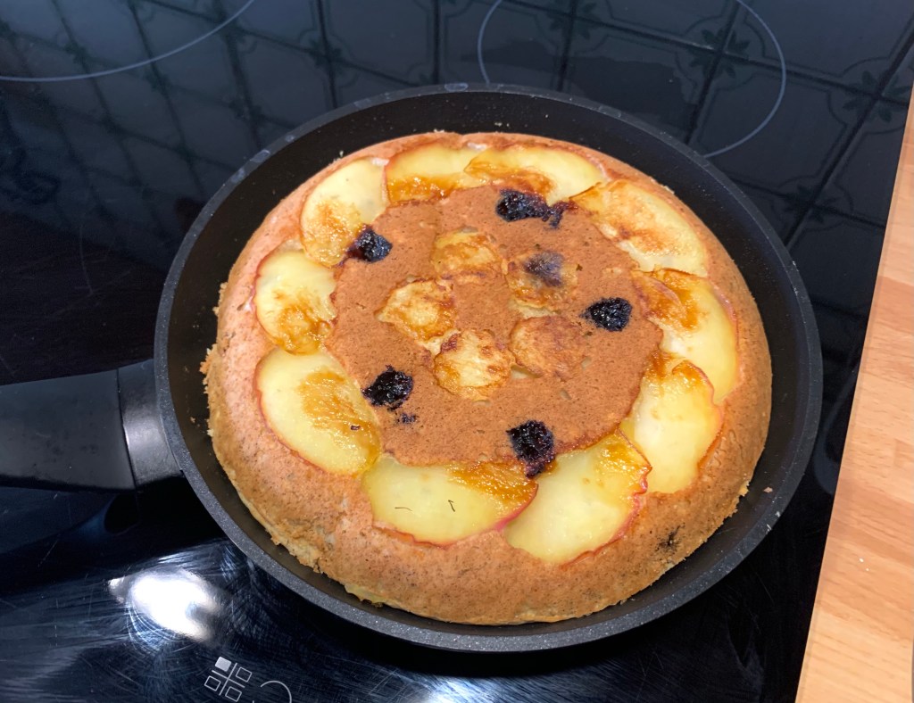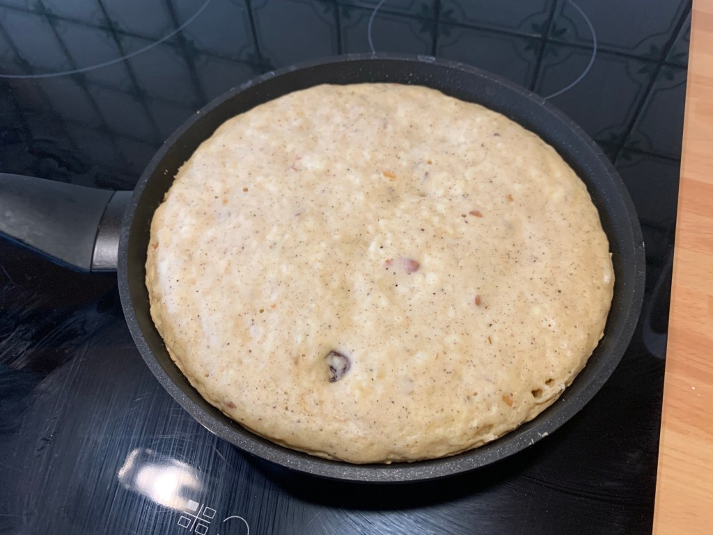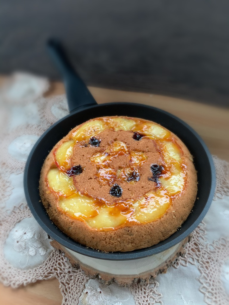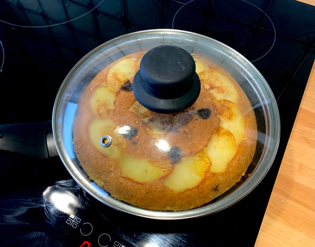 Con l’aiuto di un piatto o coperchio girare la torta nel padellino e cuocerlo sempre coperto per 7 minuti, spegnere il fuoco e laciarlo intiepidire nel padellino