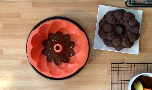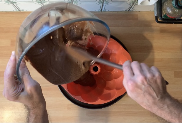 Io ho voluto renderlo più goloso glassarlo in superficie con del cioccolato fondente sciogliendolo al microonde, gli ho aggiunto l’olio vegetale, mescolato e riempito il fondo della forma di cottura della Ciambella, gli ho riposizionato la stessa ciambella facendo combaciare il disegno e messo in frizer per 1 ora
