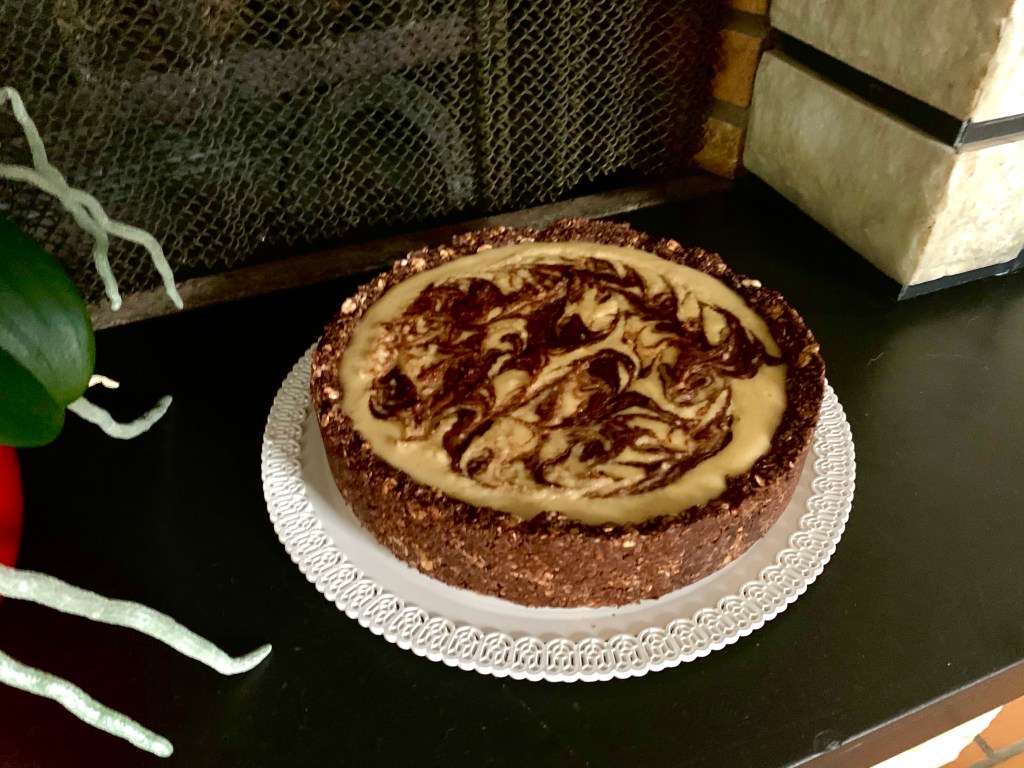 Versare la Crema di Anacardi sulla base raffreddata, livellarla e poi con il cioccolato sciolto con il latte vegetale distribuire con un cucchiaino delle gocce sulla superficie e con uno stuzzicadenti disegnare dei ghirigori