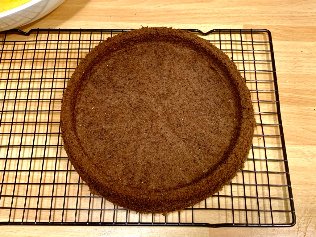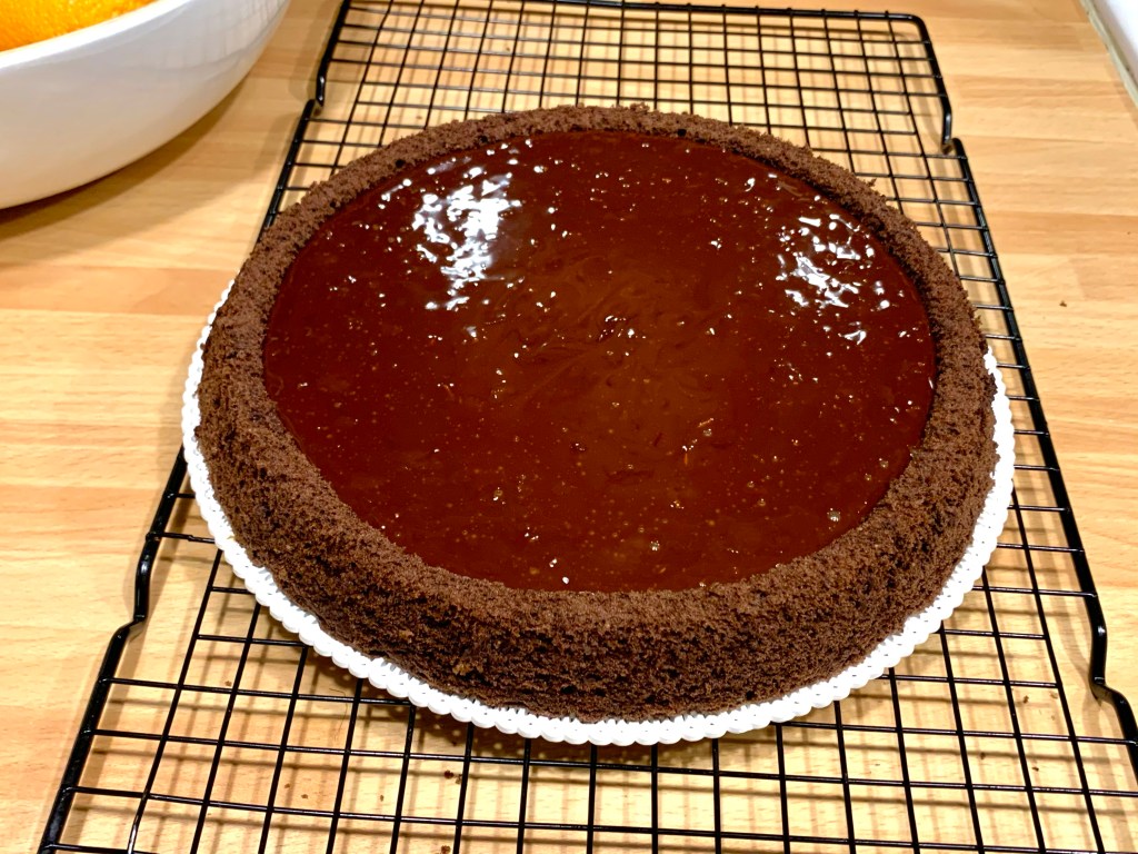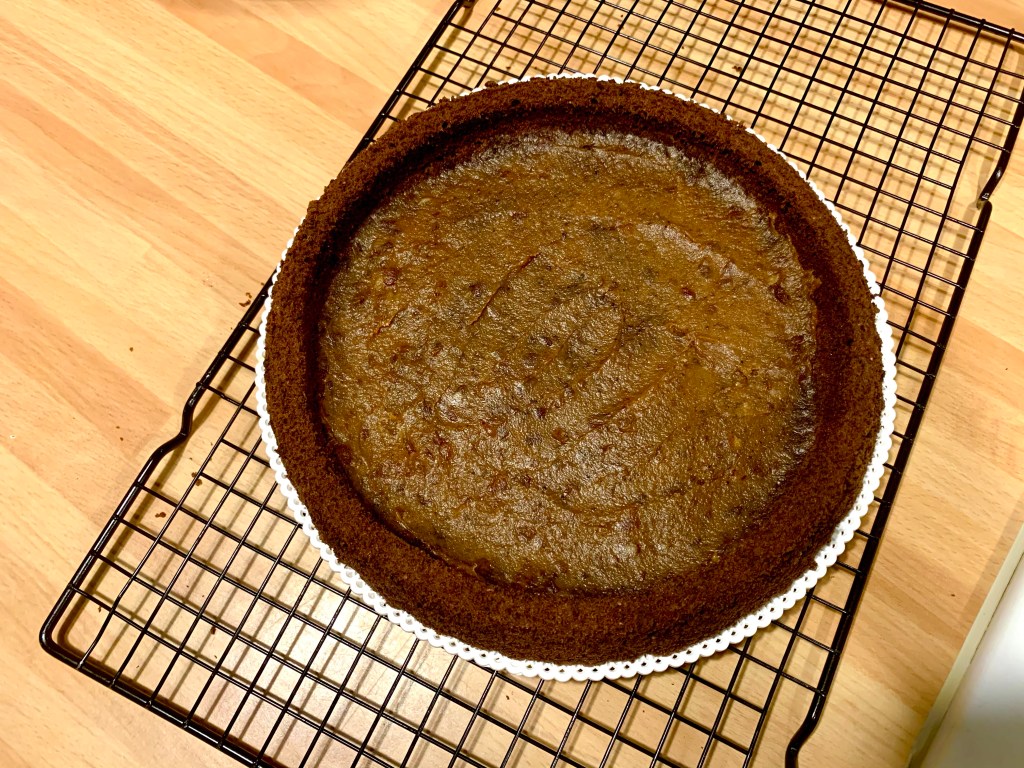 Versare la ganache nell’incavo del pan di spagna sopra la crema di datteri e mettere in frigo per 30 minuti