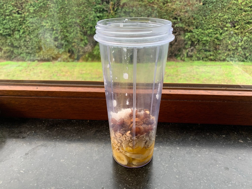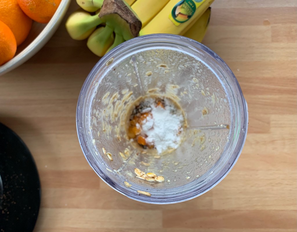 Unire nel bicchiere del frullatore la banana meno 3 fettine sottili per la decorazione, olio di cocco, l’uovo, la cannella, l’avena e frullare per 1 minuto
