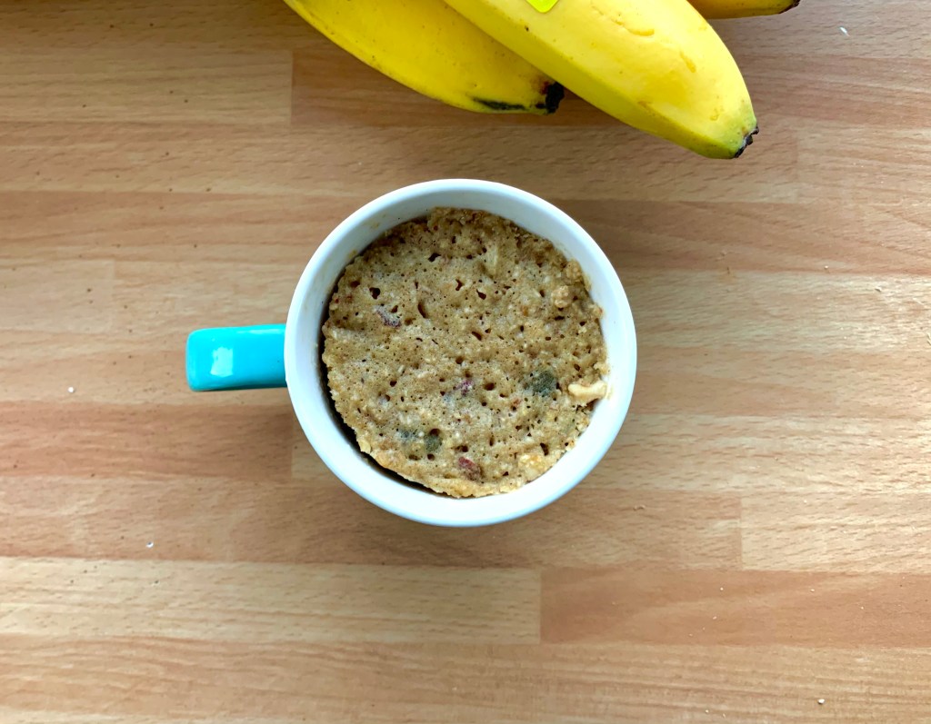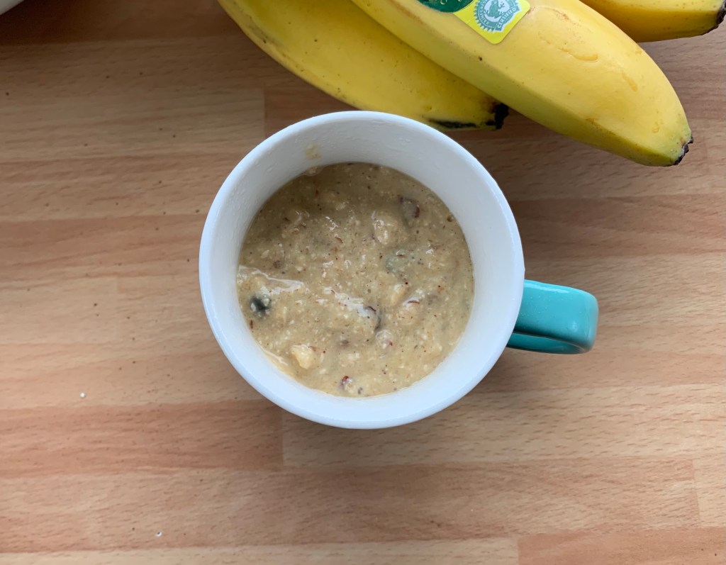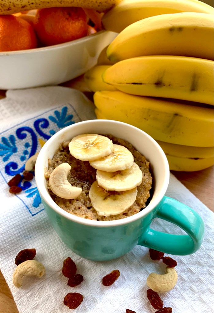 Una mug cake per una colazione sana e ricca di Fibre, banana e avena arricchiti dagli anacardi, uvetta e albicocche secche.