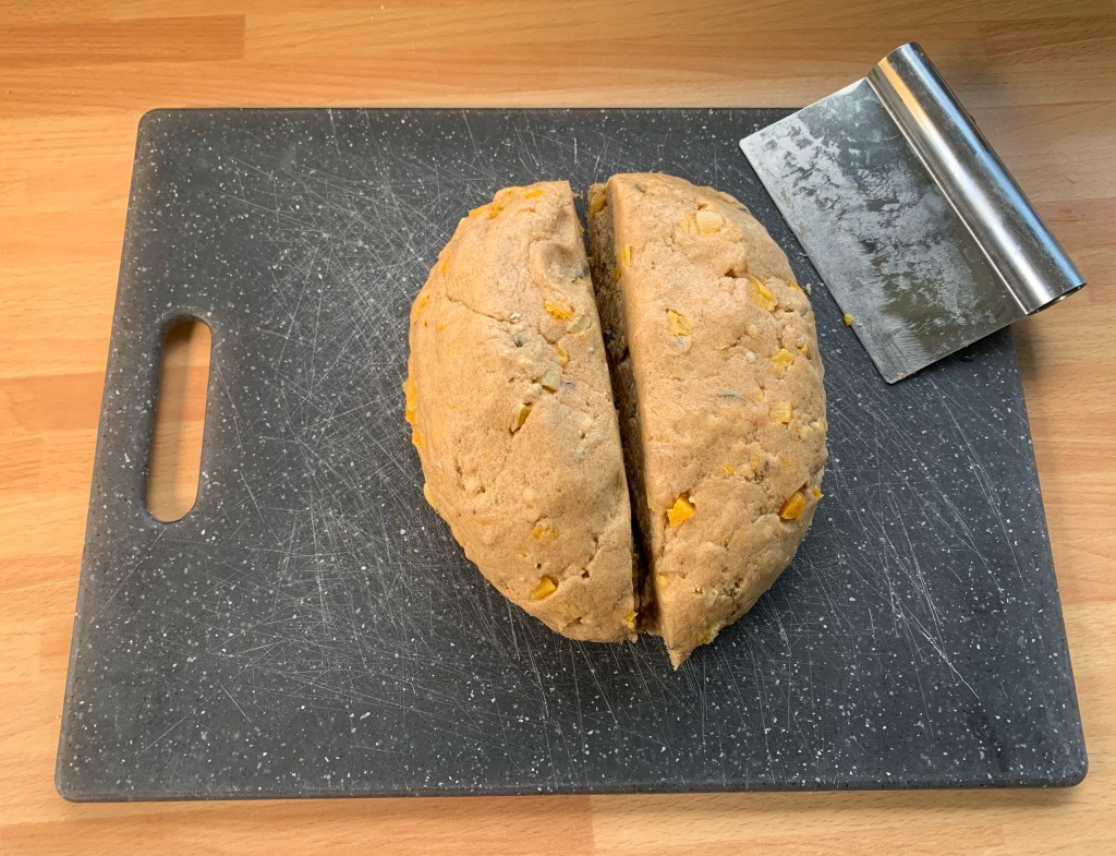 Versare l’impasto sulla spianatoia leggermente infarinata, compattarlo con le mani e poi dividerlo in due