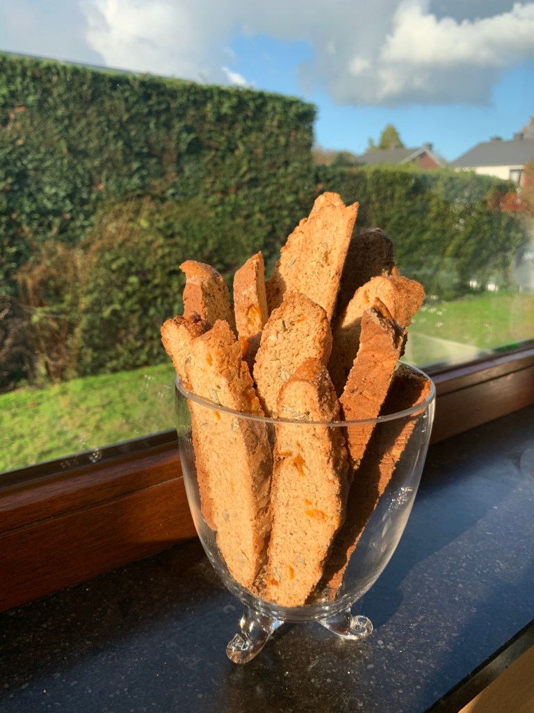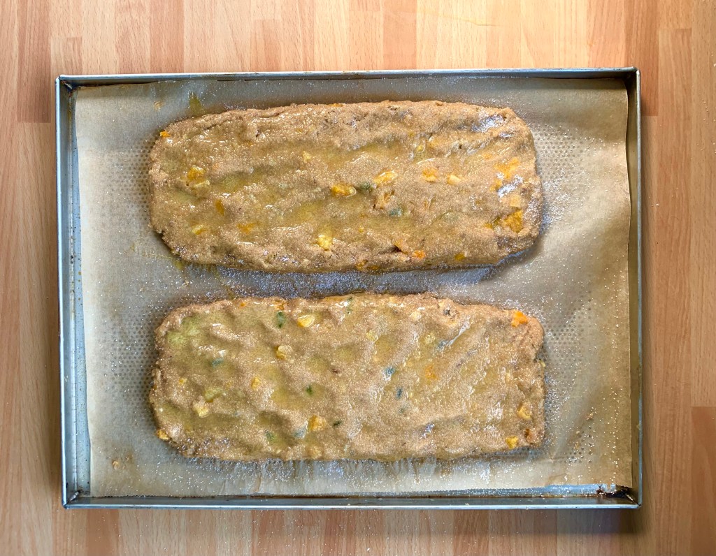 Lasciar intiepidire i filoncini una decina di minuti poi tagliarli in diagonale con un coltello a sega, dovrebbero rendere 12 biscotti da 1 cm e mezzo circa per ogni filone