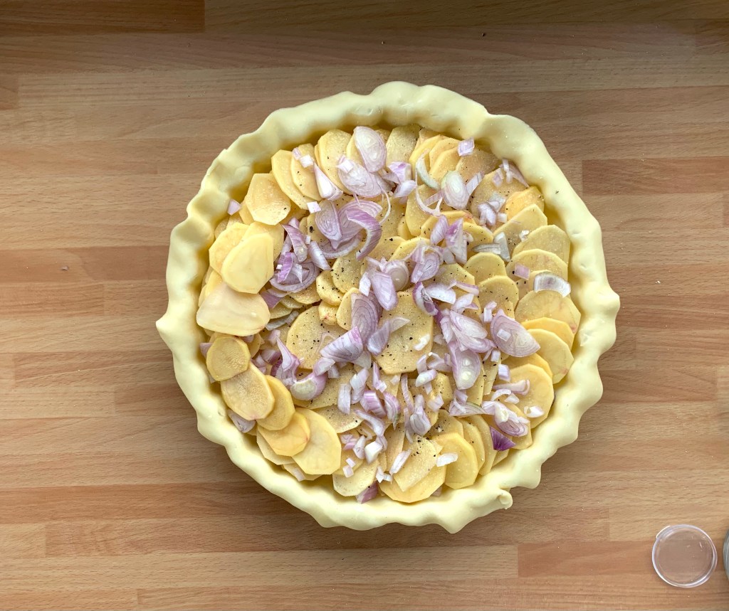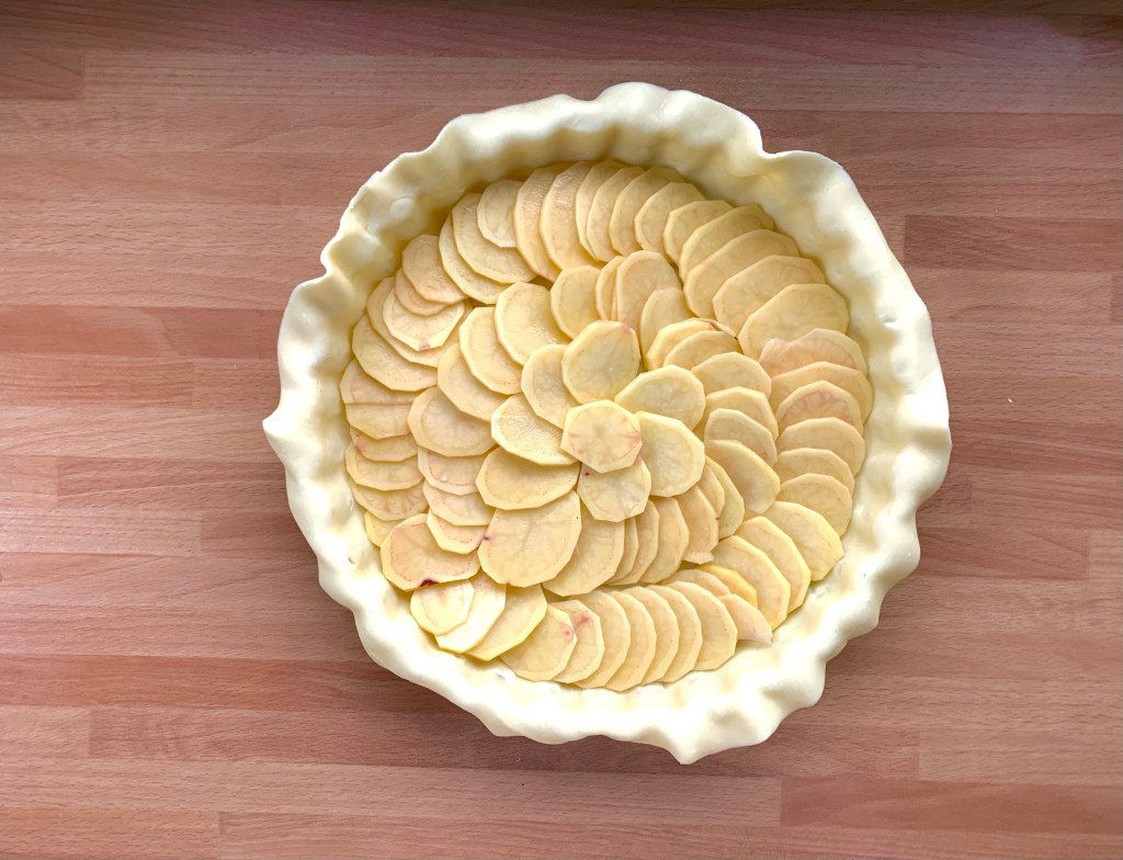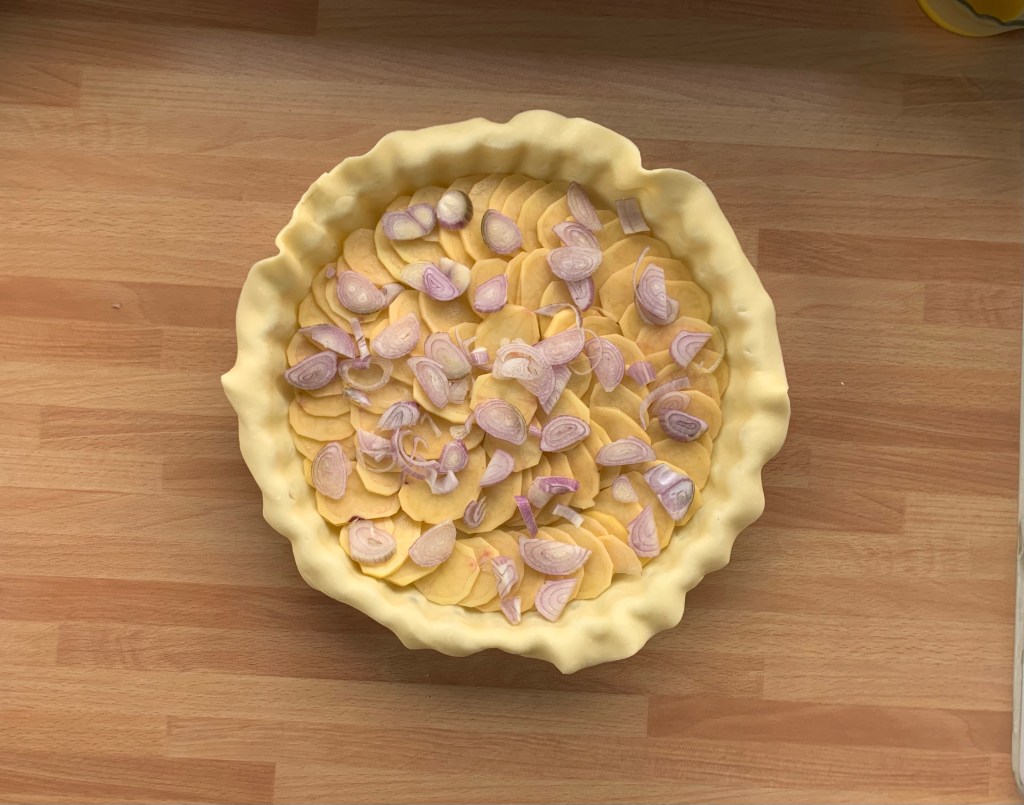 Foderare tortiera per crostate con uno dei dischi di pasta, facendo traboccare i contorni, e adagiare le fette di patate e lo scalogno in strati circolari.