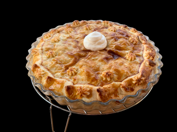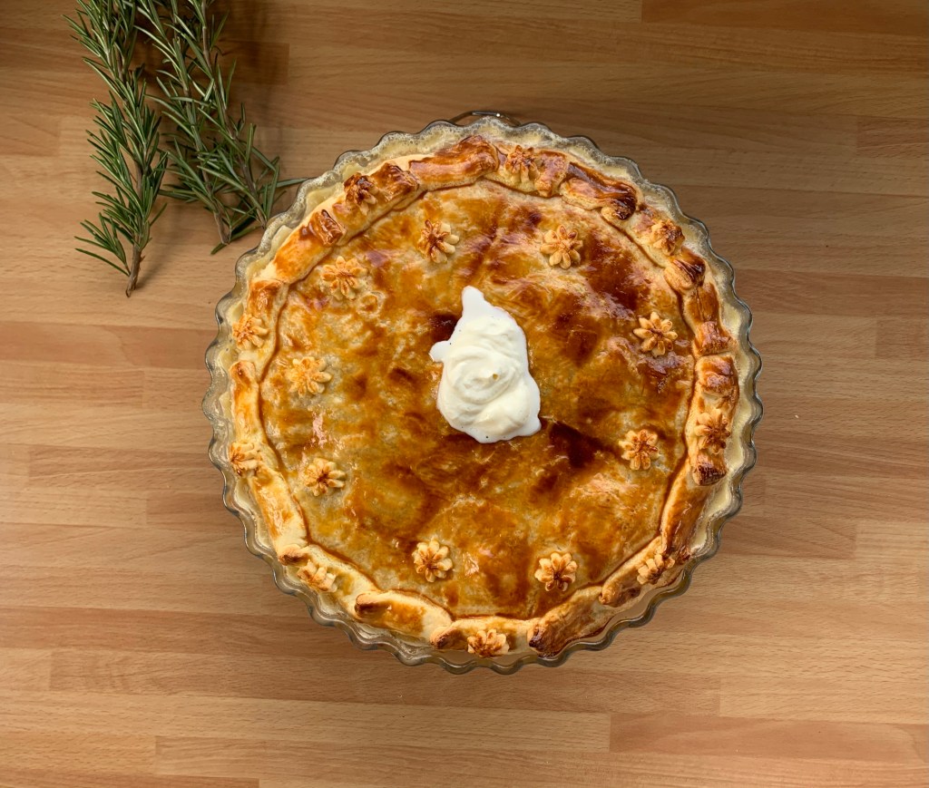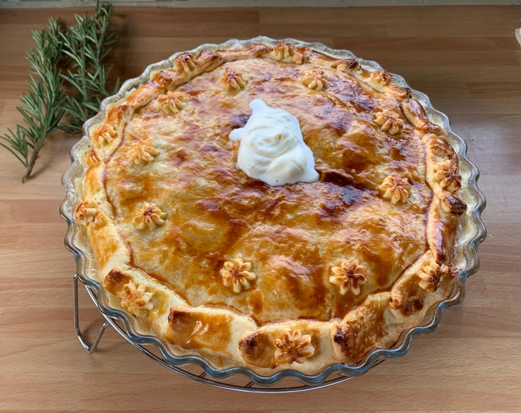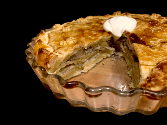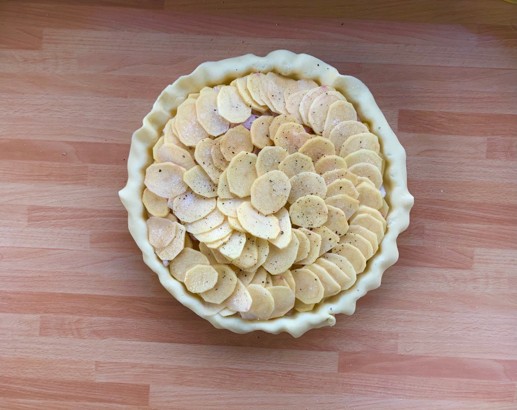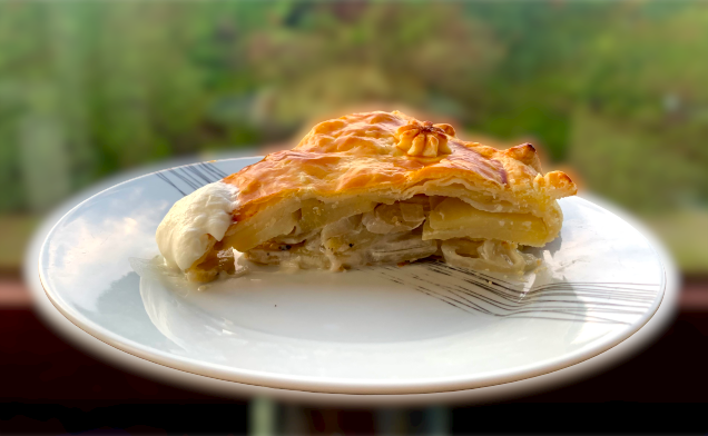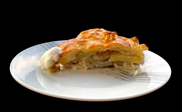 È fatto con della pasta sfoglia, o Brisé, patate, scalogno, pepe e tanta panna acida.