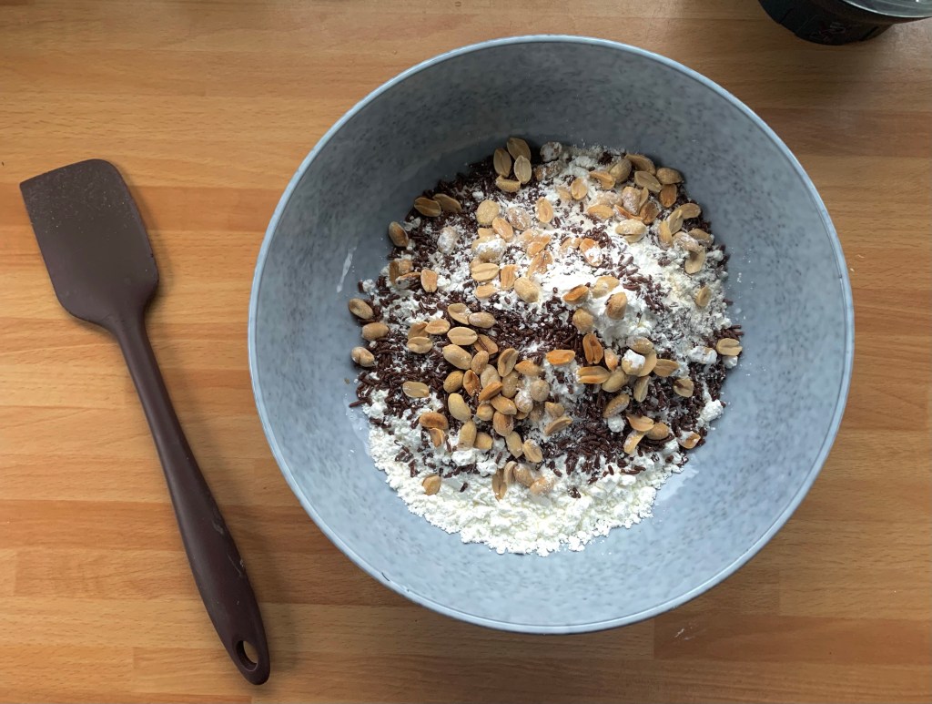 Unire in una ciotola la farina di riso, l’amido, i vermicelli di cioccolato, la gomma xantana, la prima dose di arachidi tostate e mescolare con una frusta a mano