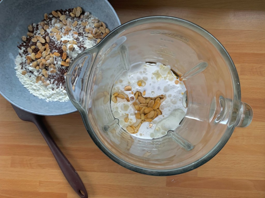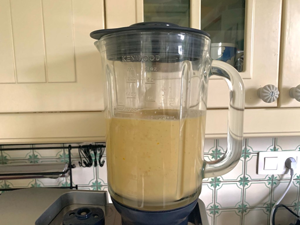 Unire nel boccale di un frullatore le uova, lo zucchero, l’olio vegetale, il latte di cocco, la seconda dose di arachidi tostate e il pizzico di sale, frullare il tutto per 2/3 minuti e aggiungere il composto alle polveri