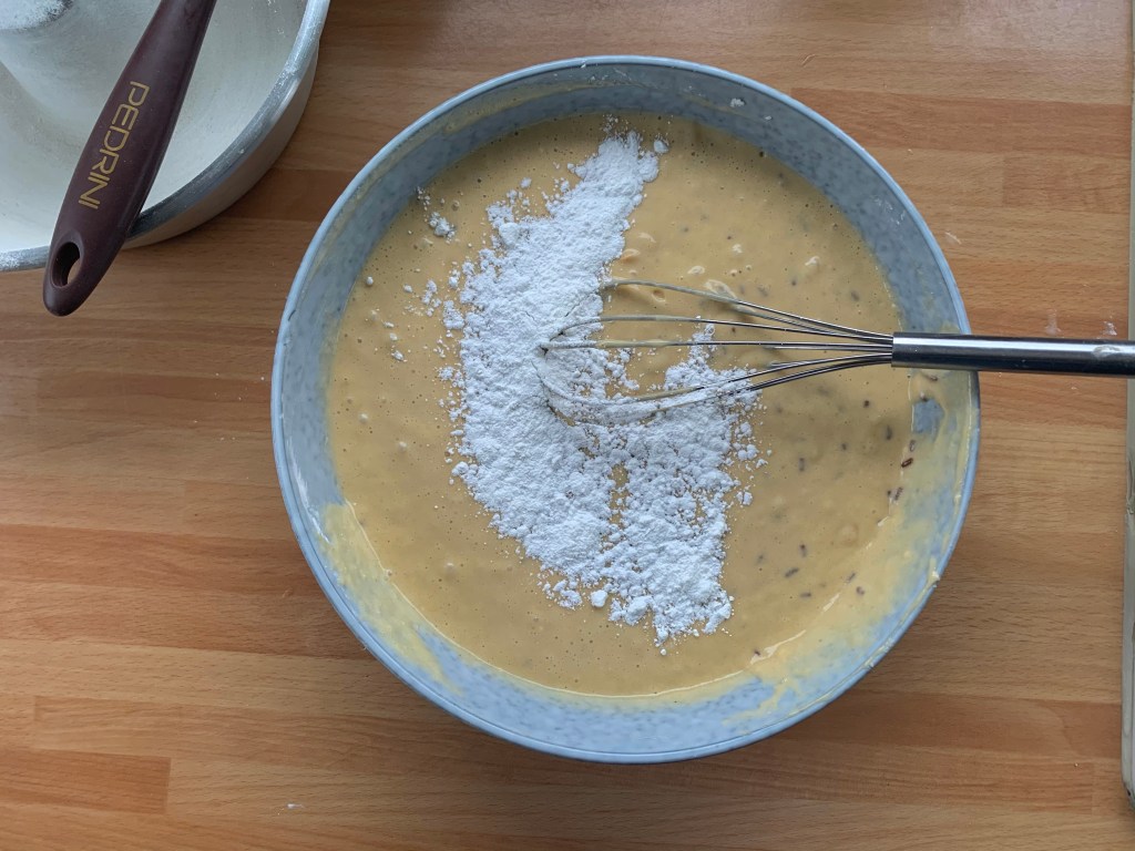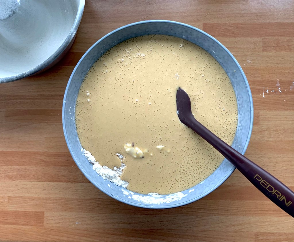 Mescolare con la frusta fino ad amalgamare l’impasto in maniera uniforme