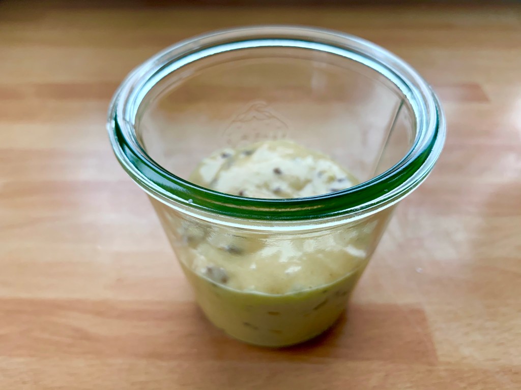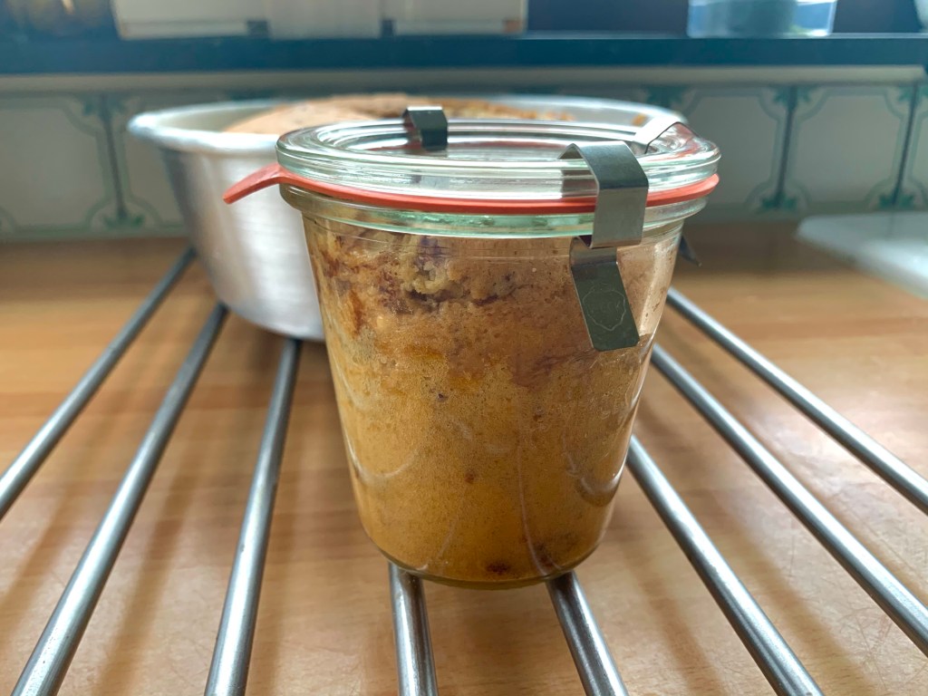 Versare il composto in una forma a ciambella unta con olio e infarinata con farina di riso meno una piccola parte da versare in un vasetto weck da 270 ml