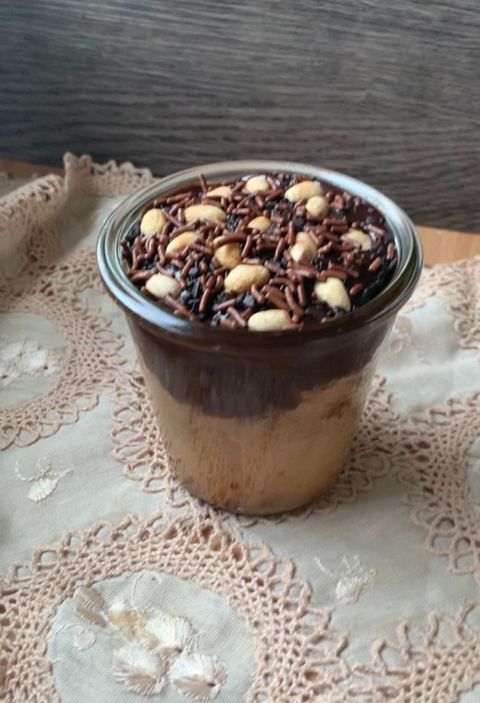 Prima di servire il dolce in vasetto versare sulla superficie la ganache, i vermicelli e le arachidi