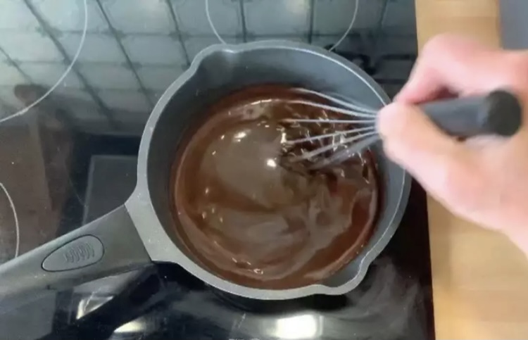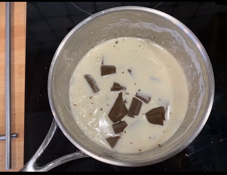 Nel frattempo preparare la ganache di cioccolato al latte di cocco portando a primo bollore il latte di cocco e si versa sulle gocce di cioccolato e con una spatola si emulsiona fino a formare una crema uniforme