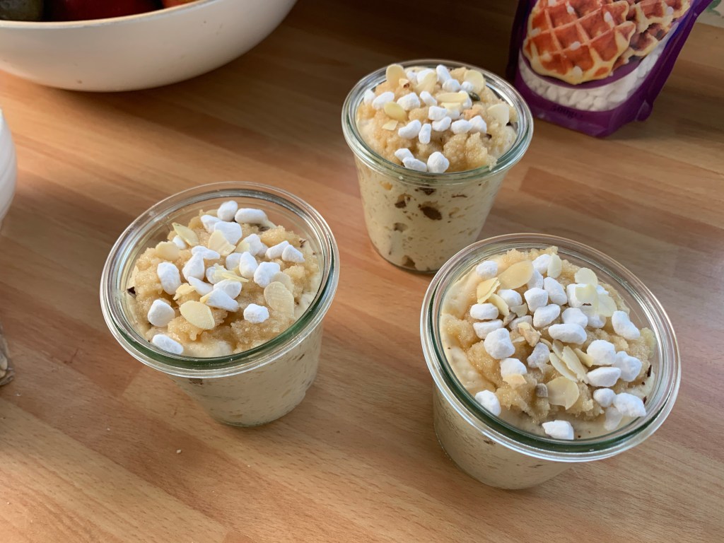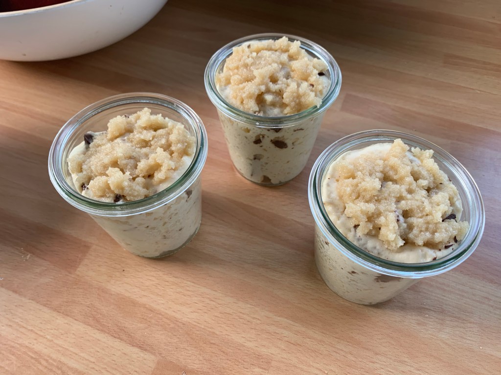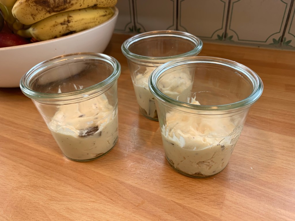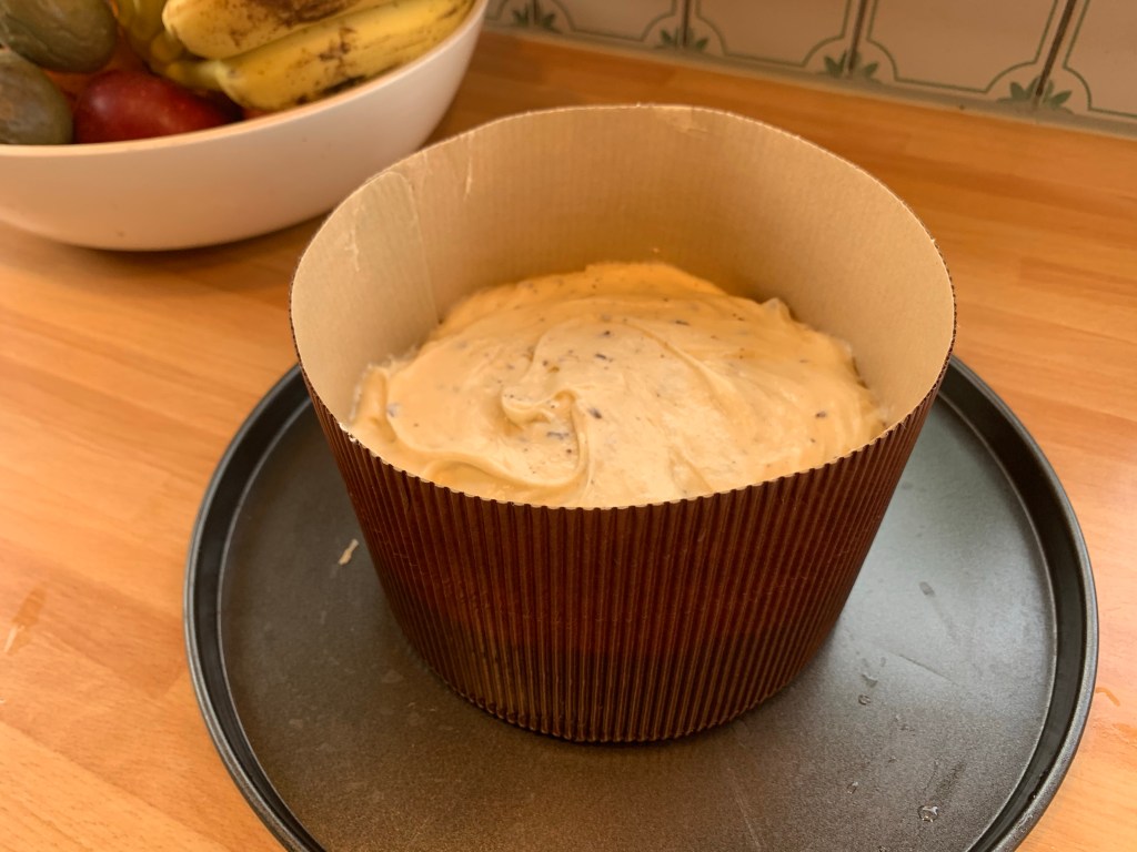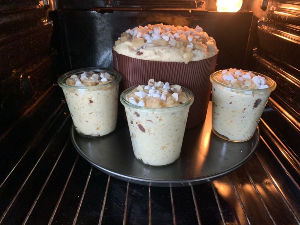 Versare poco più della metà dell’impasto nella forma in carta del panettone ed il resto dividerlo nei 3 barattoli weck da 290 ml
