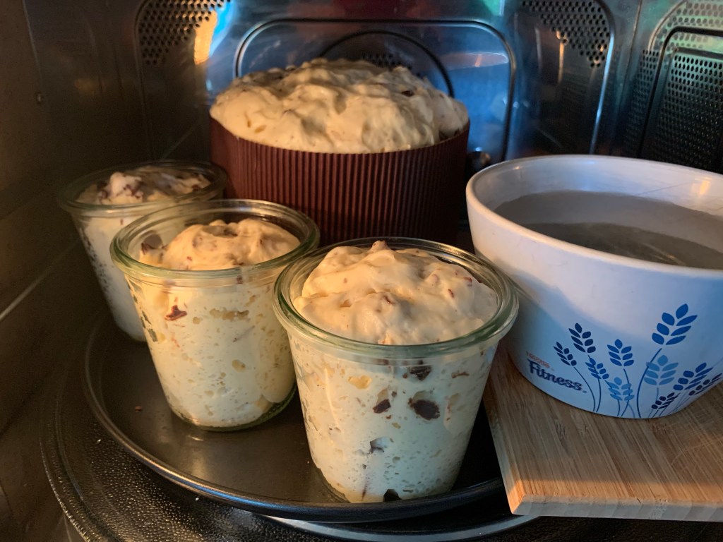 Mettere i panettoni a lievitare per almeno 1 ora o fino a quando non avrà raggiunto il bordo dello stampo. Io utilizzato il microonde spento con una tazza di acqua calda come camera di lievitazione, ma si può utilizzare il forno tradizionale spento portato a 30 gradi.