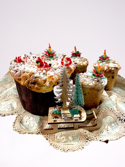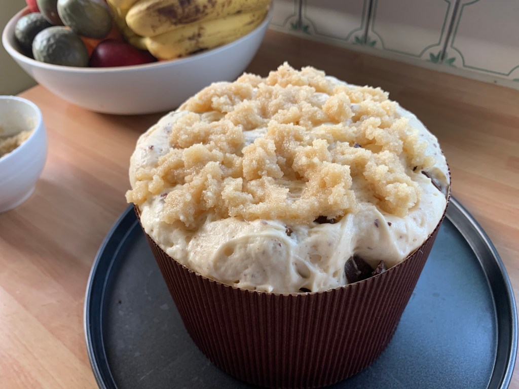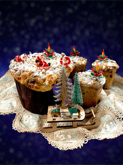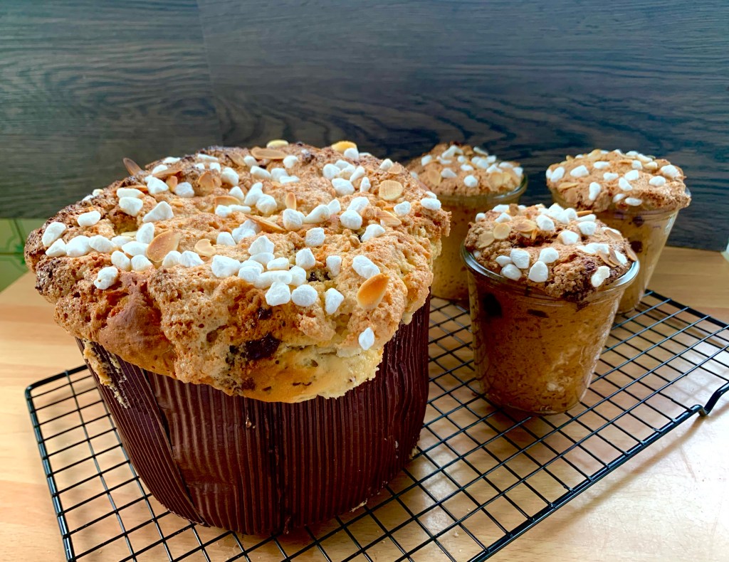 Il Panettone brasiliano, ma in una versione senza glutine, con un unico impasto e lievitazione. Un mix di farine da me preparato, aggiunta di uova, essenza di panettone e arancia, un goccio di rum e tanti pezzettoni di cioccolato. Finalizzato con una glassa alle mandorle che gli dà il classico tocco natalizio. Con le dosi utilizzate ho preparato un panettone da 750 grammi e 3 panettoncini in barattolo da 290 ml, che possono essere utilizzati come segna posto o accompagnare un piatto di dessert composto di vari dolci per il fine pasto di Natale.