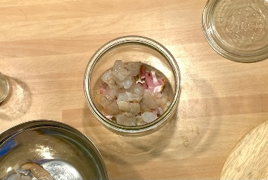 In un vasetto weck da 500 ml unire l’olio, la pancetta, l’aglio, il vino e i gamberi, soffriggere al microonde per 1 minuto e mezzo a 750 watt
