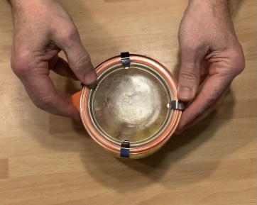 Finita la cottura, sempre con un panno, prendere il vasetto agitarlo e poi lasciarlo riposare su una gratella per 20 minuti, dove completerà la cottura e si creerà il sottovuoto