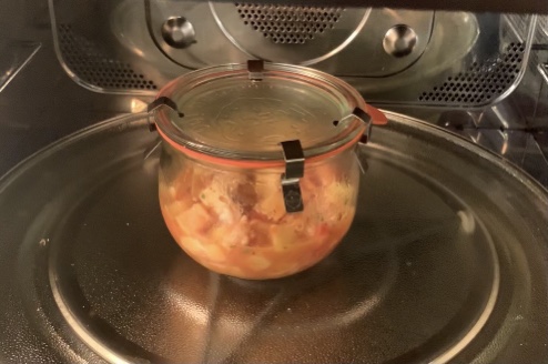 Pulire i bordi del vasetto, chiuderlo con il tappo, la guarnizione e 4 gancetti poi trasferirlo al microonde per 5 minuti e 30 secondi a 750 watt, a metà cottura aprire il forno microonde e con l’ausilio di un panno agitare il vaso per far mescolare gli ingredienti