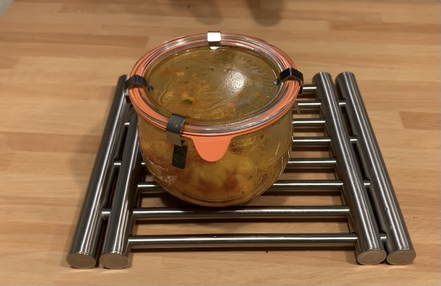 Il riposo dopo la cottura permetterà al vasetto di creare il sottovuoto che permetterà la conservazione della pietanza fino ad un settimana in frigo. Poi basterà rimuovere i gancetti e rimettere al microonde il vasetto per 2/3 minuti per assaporare l ricetta come appena fatta. Si consiglia lasciare il vasetto fuori frigo 5/10 minuti prima di passarlo al microonde per evitare lo choc termico.