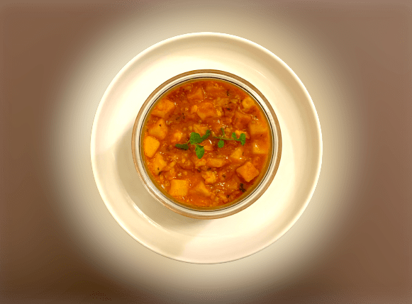 Aggiungere i cubettini di patate, la curcuma, la salsa di pomodori, l’acqua, il sale, il pepe, il prezzemolo e mescolare il tutto con un cucchiaio